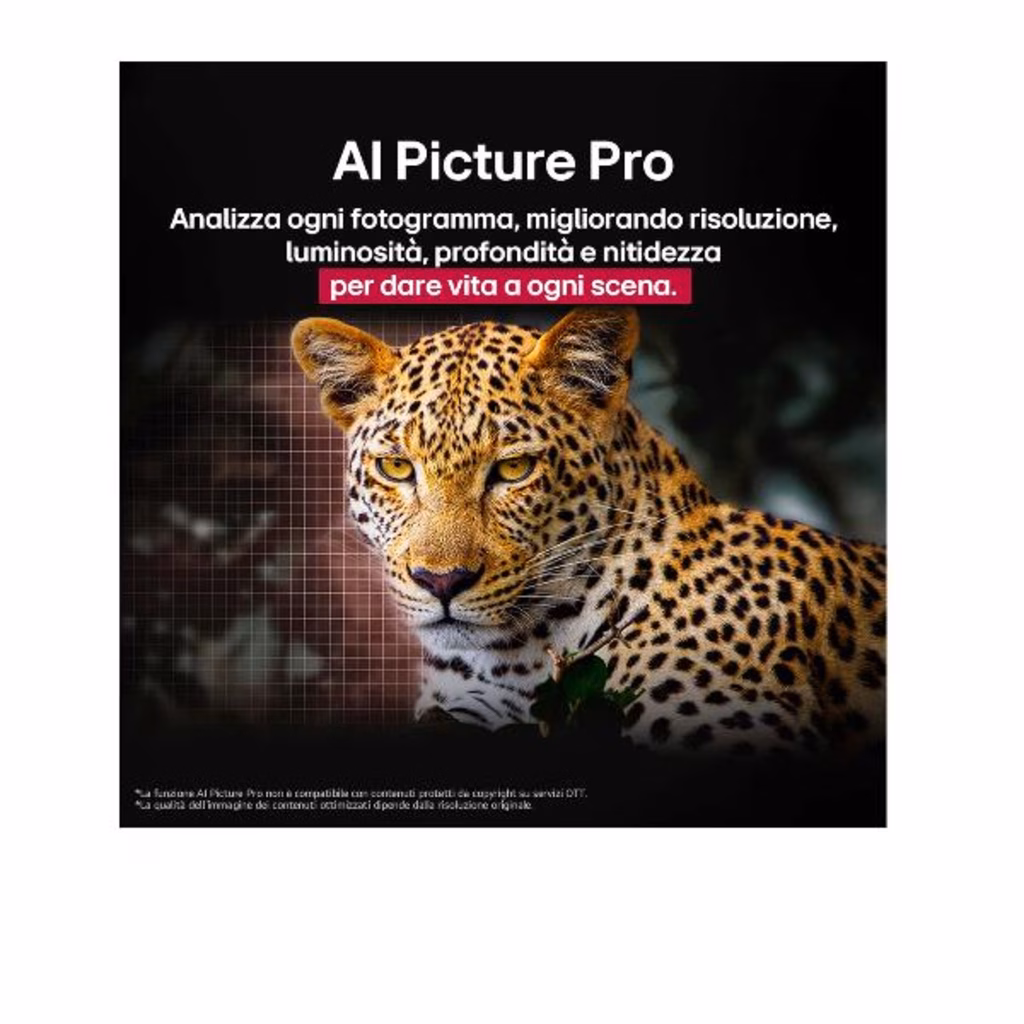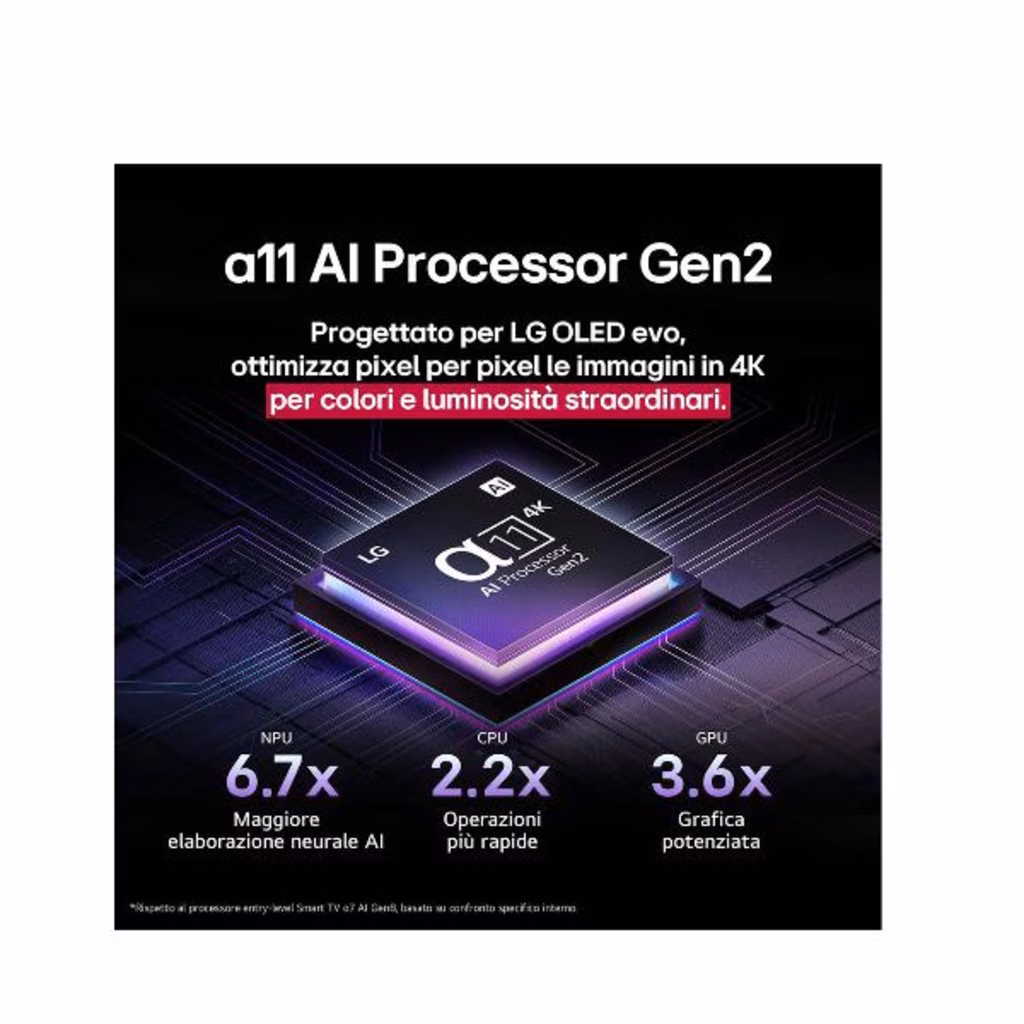 Il nuovo processore a11 gen2 con AI offre un'esperienza visiva straordinaria con qualità d'immagine 4K, arricchita da dettagli ottimizzati tramite l'Intelligenza Artificiale, che analizza in tempo reale ogni scena per esaltare la nitidezza e la profondità. Inoltre, grazie alla potenza del processore a11 gen2 con AI, il suono diventa altrettanto coinvolgente, garantendo un audio surround immersivo che completa perfettamente la visione, portando il tuo intrattenimento a un livello superiore.