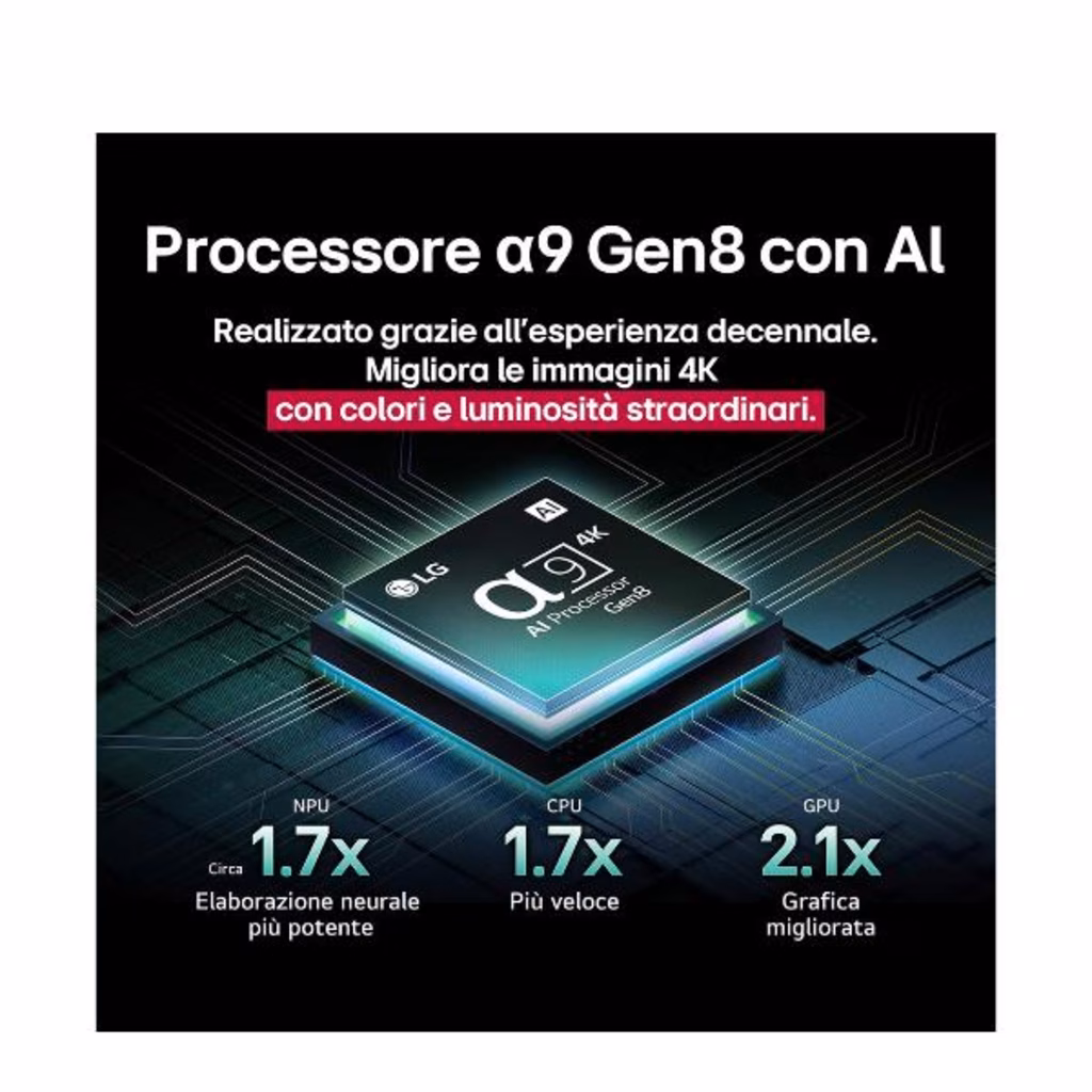 Il processore a9 sviluppato da LG è progettato per sfruttare al meglio la tecnologia OLED e darti un realismo incredibile. Giunto all'ottava generazione, questo processore conosce a fondo le caratteristiche del pannello e sfrutta gli algoritmi di deep-learning dell'Intelligenza Artificiale progressiva per riconoscere le scene di ciò che stai guardando e ottimizzare di conseguenza i contenuti, esaltando ciascun soggetto sulla scena.