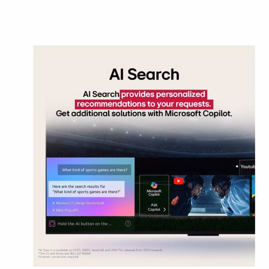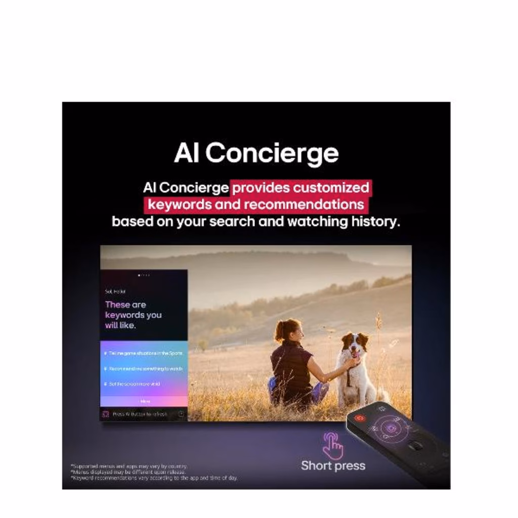Quando accendi il TV, riconosce automaticamente la tua voce e imposta il tuo profilo per darti un'esperienza personalizzata. Ad esempio, ti consiglia nuovi contenuti da guardare in base alla tua cronologia di visione, imposta la schermata principale con le app che usi di più e ti suggerisce le parole chiave da usare per scoprire nuove funzioni.