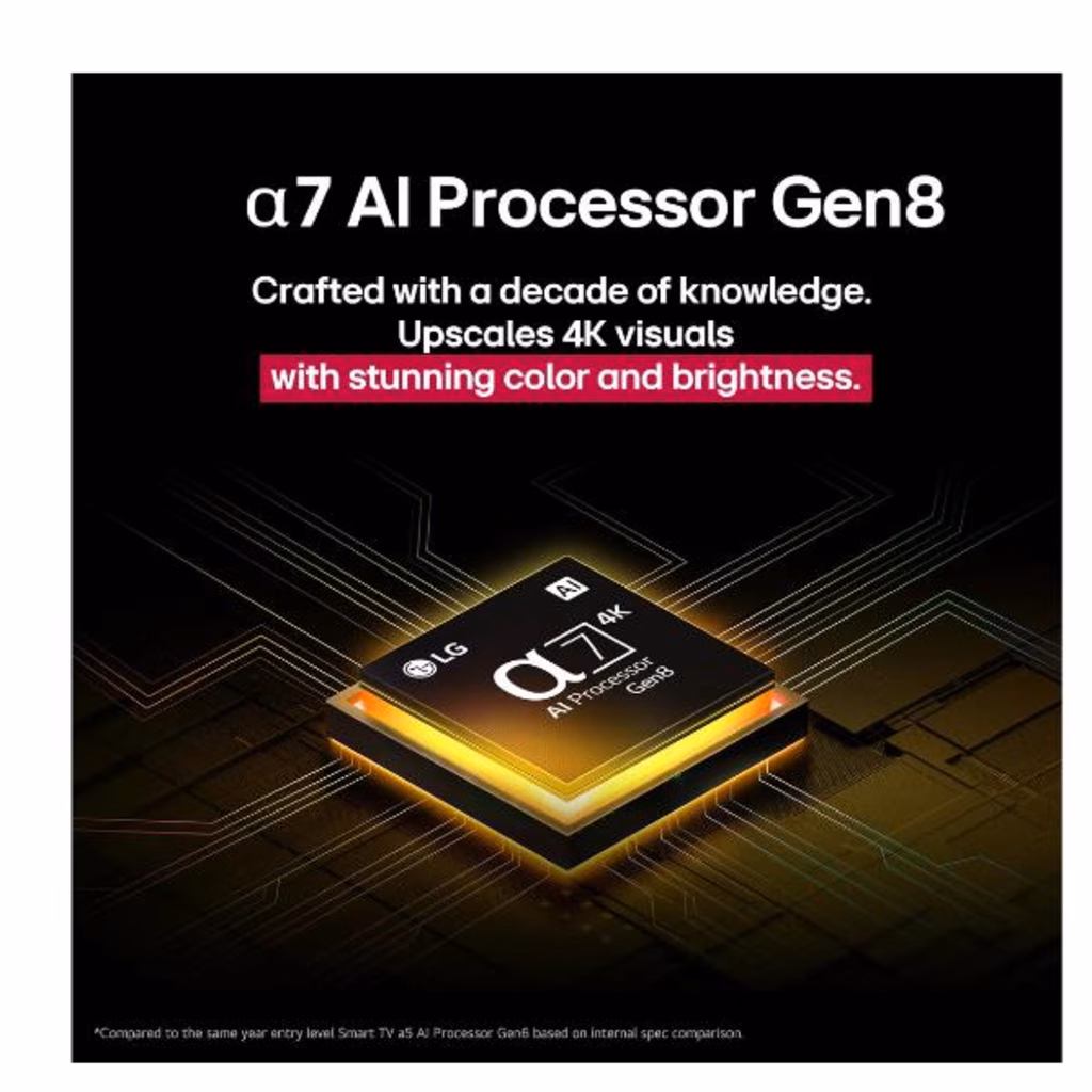 Il nuovo processore a7 Gen8 offre prestazioni superiori rispetto al modello precedente, grazie a una maggiore memoria e a una velocità di elaborazione più elevata. Utilizzando l'Intelligenza Artificiale, ottimizza i contenuti visualizzati sul TV con un'elaborazione accurata delle immagini e del suono. Trasforma i contenuti a risoluzione inferiore in 4K e rende l'audio più avvolgente con 9.1.2 canali virtuali.