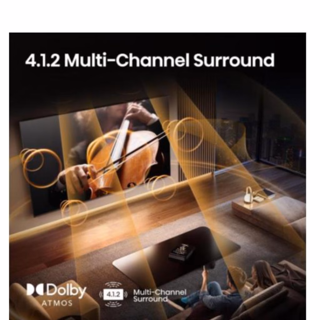 Gli altoparlanti laterali, i subwoofer posteriori e gli altoparlanti rivolti verso l'alto si fondono per un'esperienza multicanale 4.1.2. Goditi gli strati di profondità dall'alto e dall'esterno, il tutto senza il fastidio di configurazioni complesse. Solo un suono puro e coinvolgente in perfetta armonia con le tue immagini.