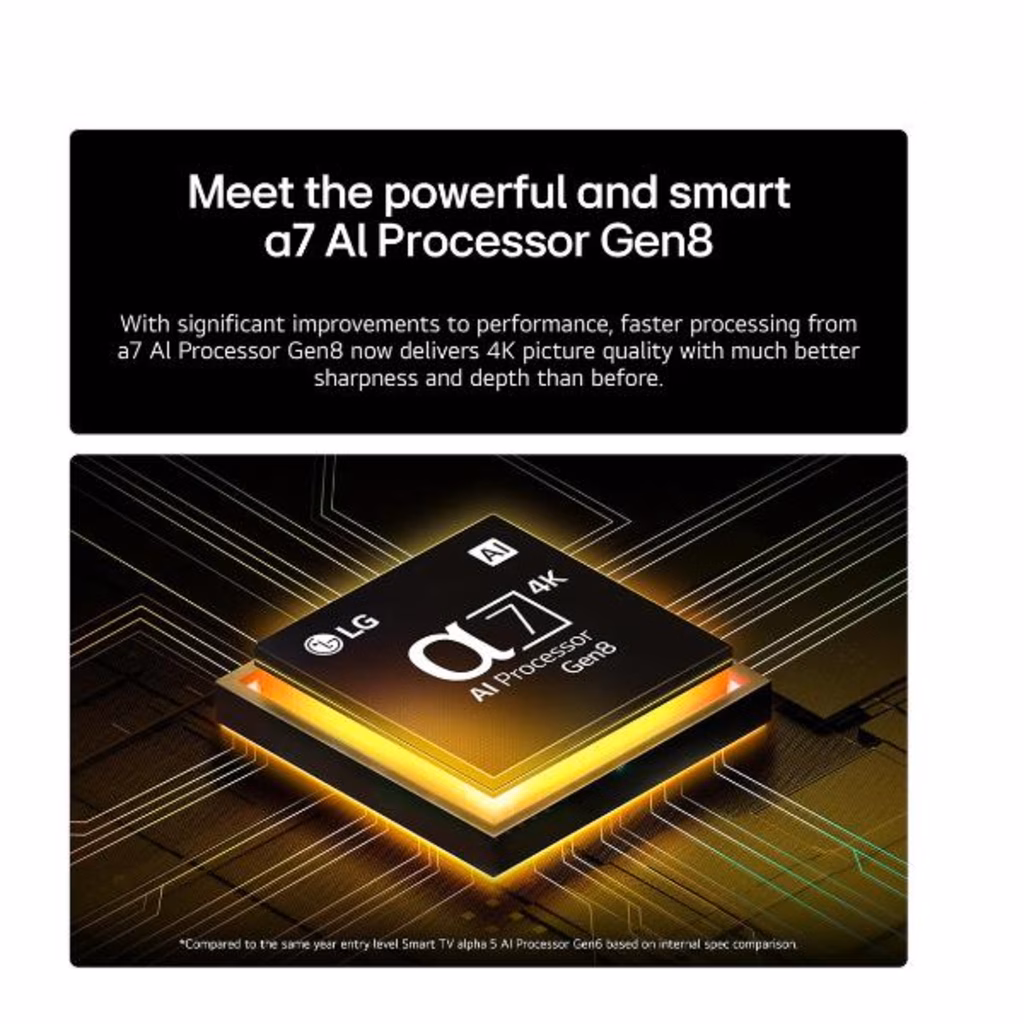 Il nuovo processore a7 Gen8 offre prestazioni superiori rispetto al modello precedente, grazie a una maggiore memoria e a una velocità di elaborazione più elevata. Utilizzando l'Intelligenza Artificiale, ottimizza i contenuti visualizzati sul TV con un'elaborazione accurata delle immagini e del suono. Trasforma i contenuti a risoluzione inferiore in 4K e rende l'audio più avvolgente con 9.1.2 canali virtuali.