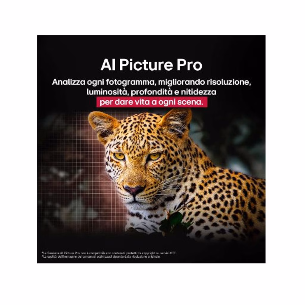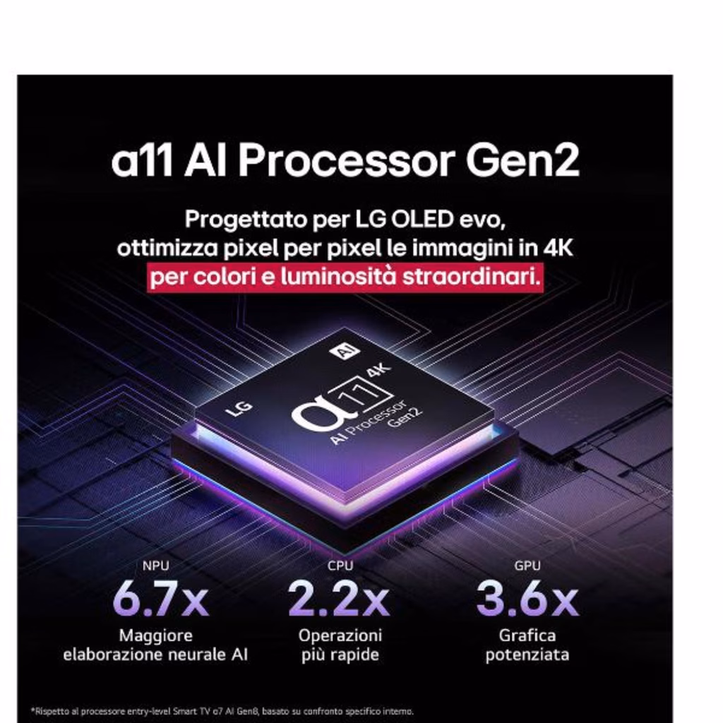 Il nuovo processore a11 gen2 con AI offre un'esperienza visiva straordinaria con qualità d'immagine 4K, arricchita da dettagli ottimizzati tramite l'Intelligenza Artificiale, che analizza in tempo reale ogni scena per esaltare la nitidezza e la profondità. Inoltre, grazie alla potenza del processore a11 gen2 con AI, il suono diventa altrettanto coinvolgente, garantendo un audio surround immersivo che completa perfettamente la visione, portando il tuo intrattenimento a un livello superiore.