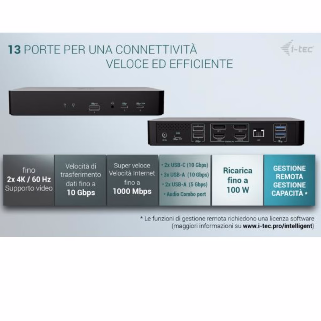 Sperimenta un grande progresso nella tecnologia di accoppiamento con una stazione universale ad alte prestazioni progettata per una gestione remota completa. Grazie alla porta LAN dedicata, gli amministratori di TI possono controllare la stazione di accesso da qualsiasi luogo, anche fino al livello di gestione delle porte individuali. Il software di gestione remota è disponibile come complemento opzionale e può essere acquistato in qualsiasi momento. Ovviamente, la stazione di adattamento funziona con tutte le sue funzioni anche senza il software; l'unica limitazione è l'utilizzo delle funzioni di gestione remota. E la cosa migliore: la capacità di gestione funziona senza connessione a un host, solo se necessaria alimentazione e LAN.