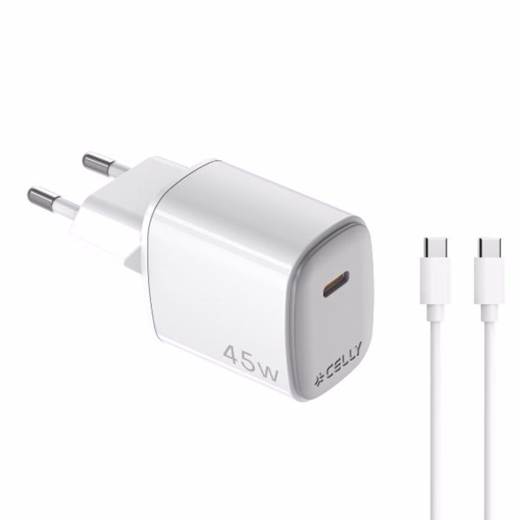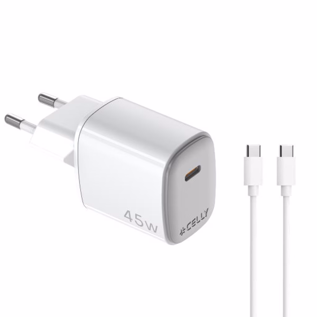 Il caricabatterie da muro UPTC da 45W con 1 porta USB-C e cavo USB-C da 2 metri offre una ricarica potente e efficiente grazie alla tecnologia GaN.