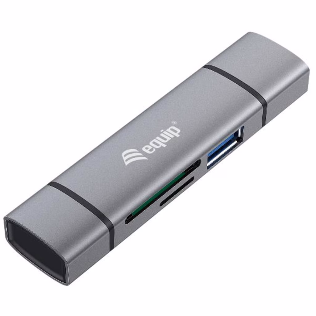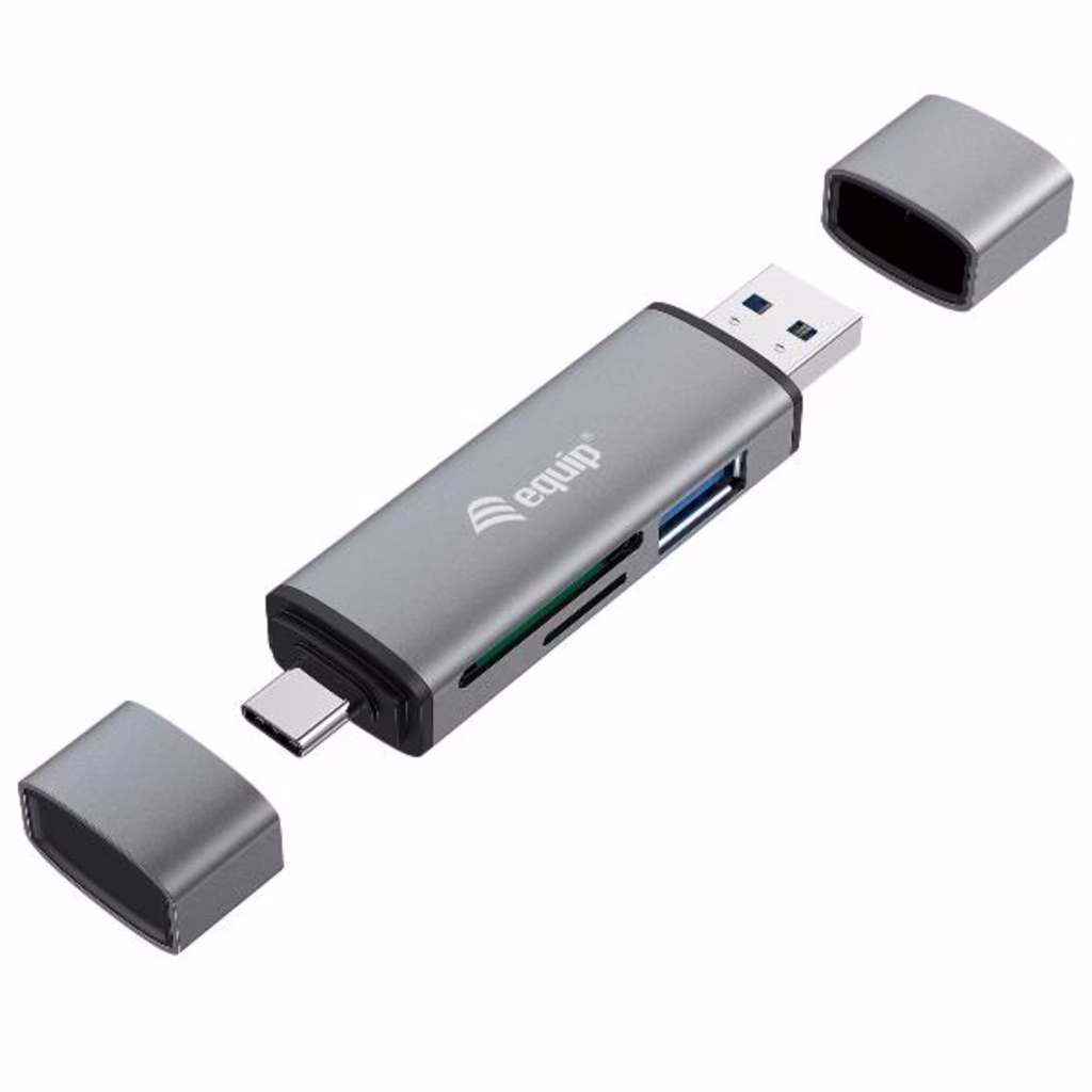 Il lettore di schede equip 245460 con hub USB integrato (OTG) può essere collegato al tuo smartphone, tablet o notebook. Ciò consente di accedere ai supporti di memorizzazione inseriti come chiavette USB, schede di memoria SD o MicroSD. È possibile collegare il dispositivo tramite la presa USB A (USB 3.0) dell'hub o la presa USB-C .