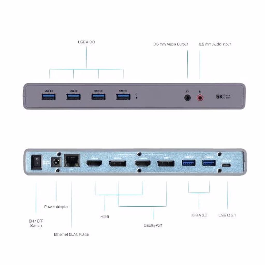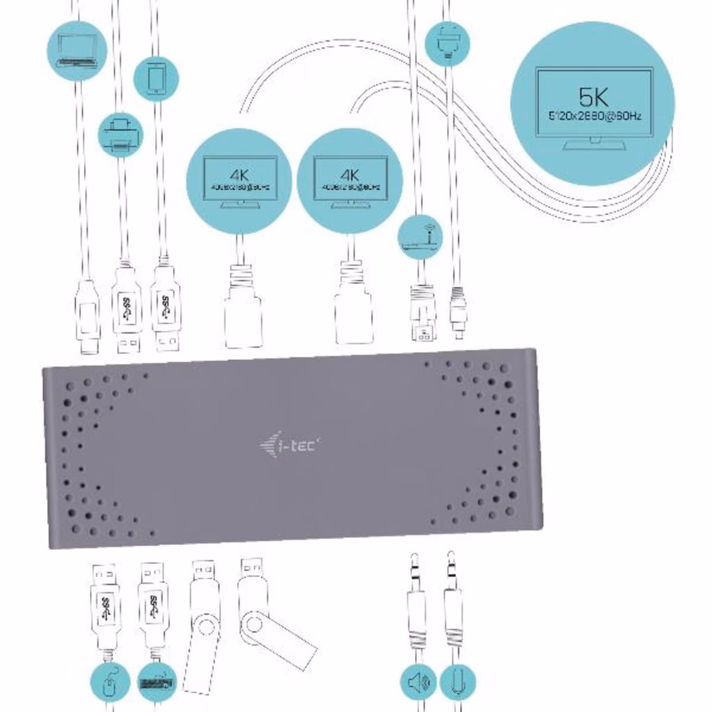 i-tec Stazione dock universale USB-A 3.0 / USB-C 5K 60 Hz, uscite video duali 4K 60 Hz, 2 porte HDMI, 2 porte Display Port, 1 porta Ethernet, 6 porte USB 3.0, 1 uscita e 1 ingresso Audio Jack, interruttore ON/OFF, supporta Kensington Lock, Windows, Mac OS, Linux e Android