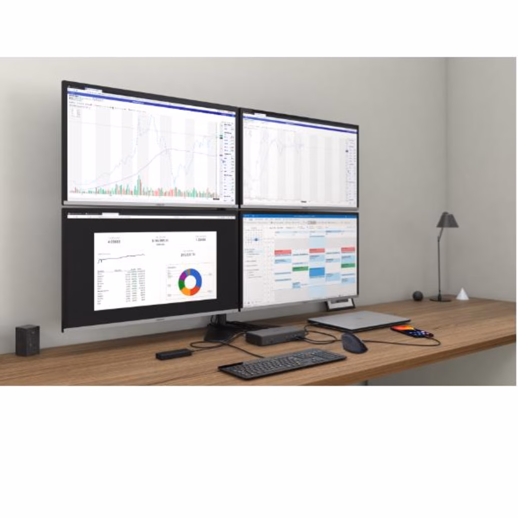 Docking station professionale USB-C, La quale supporta fino a quattro monitor esterni. Questa docking station è dotata di elaborazione delle immagini ibrida: si basa sulle tecnologie di trasmissione video DisplayLink e USB-C, che gli consentono di elaborare le immagini su un massimo di quattro dispositivi di visualizzazione.