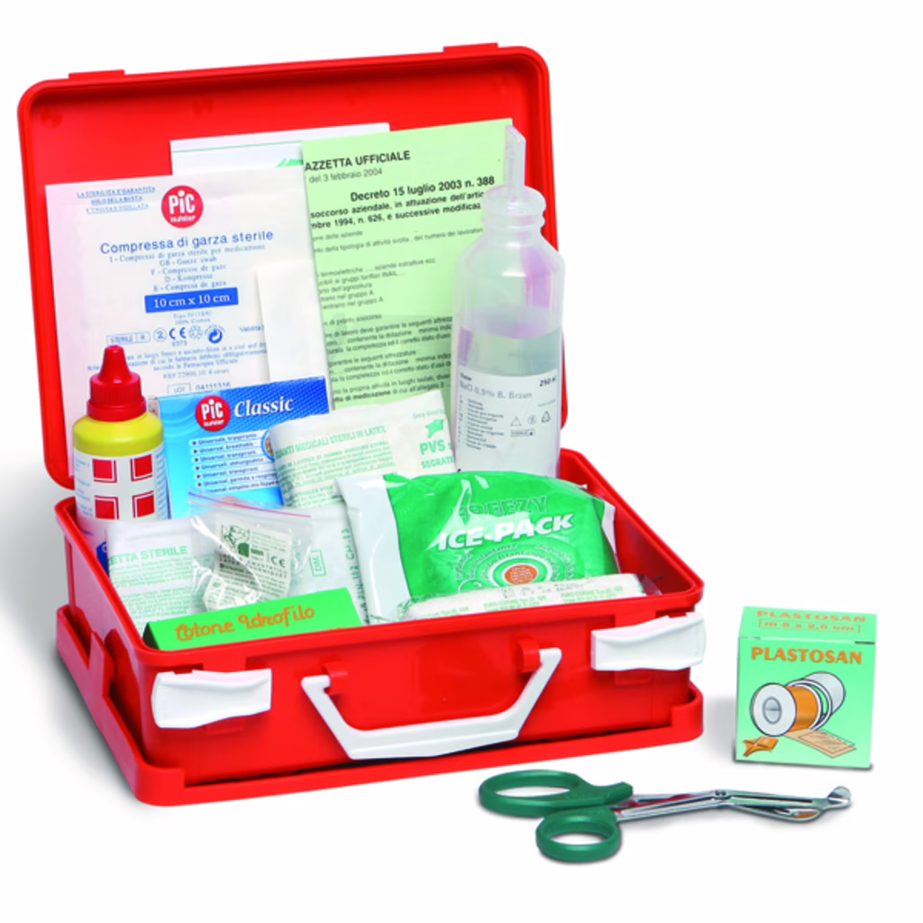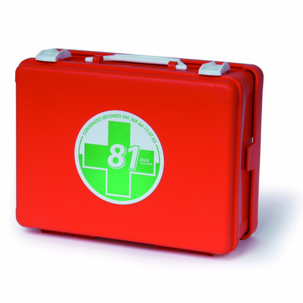 Valigetta in polipropilene a vano unico. Contenuto secondo lAll. 2 del D.lgs. 81/2008-D.M.388/2003 per aziende del gruppo C con meno di tre lavoratori e per i lavoratori che operano in luoghi diversi dalla sede aziendale o unità produttiva - CONTENUTO: 1 copia Decreto Legislativo n° 81/ 2008 - istruzioni per luso dei presidi contenuti e per le prestazioni dei primi soccorsi in attesa dei servizi d'emergenza - 125 ml di soluzione cutanea di iodopovidone al 10% iodio - 250 ml di soluzione fisiologica (sodio cloruro 0,9%) - 2 paia di guanti sterili monouso - 3 compresse di garza sterile cm 10×10 in buste singole - 1 compressa di garza sterile cm 18×40 in buste singole - 1 pinzetta da medicazione sterile monouso - 1 confezione cotone idrofilo - 1 confezione da 10 cerotti di varie misure pronti all'uso - 1 rotolo di cerotto alto cm 2,5x 5 m - 1 rotolo di benda orlata alta cm 10x 4 m - 1 paio di forbici - 1 laccio emostatico - 1 confezione di ghiaccio pronto uso - 1 sacchetto monouso per la raccolta di rifiuti sanitari