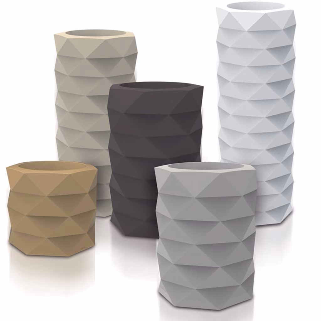 Originato dall'ispirazione del taglio del diamante. Il suo design poligonale richiama sfaccettature create attraverso il taglio. Le forme chiare ed eleganti creano un'enorme visuale d'impatto. In polietilene per uso interno/esterno in finitura laccata. 100% riciclabile. ORDINE MINIMO URO 1000,00+Iva, altrimenti contributo trasporto uro 75,00+Iva