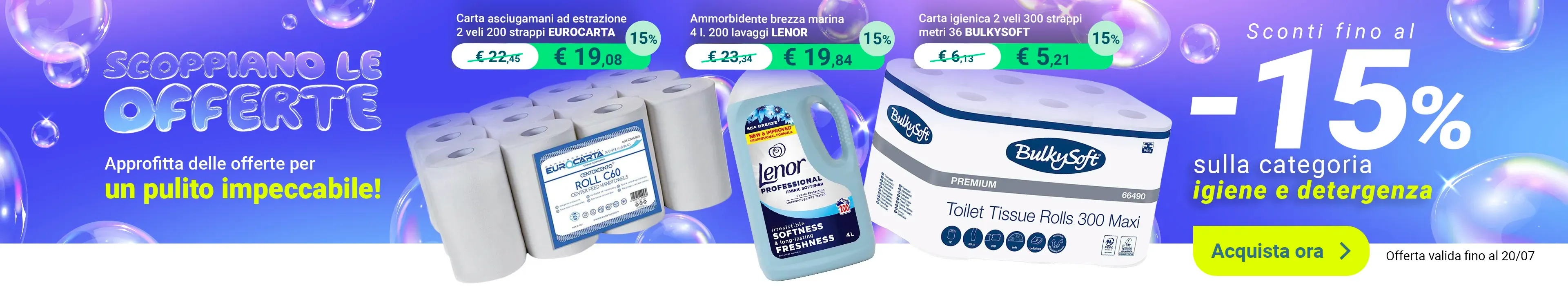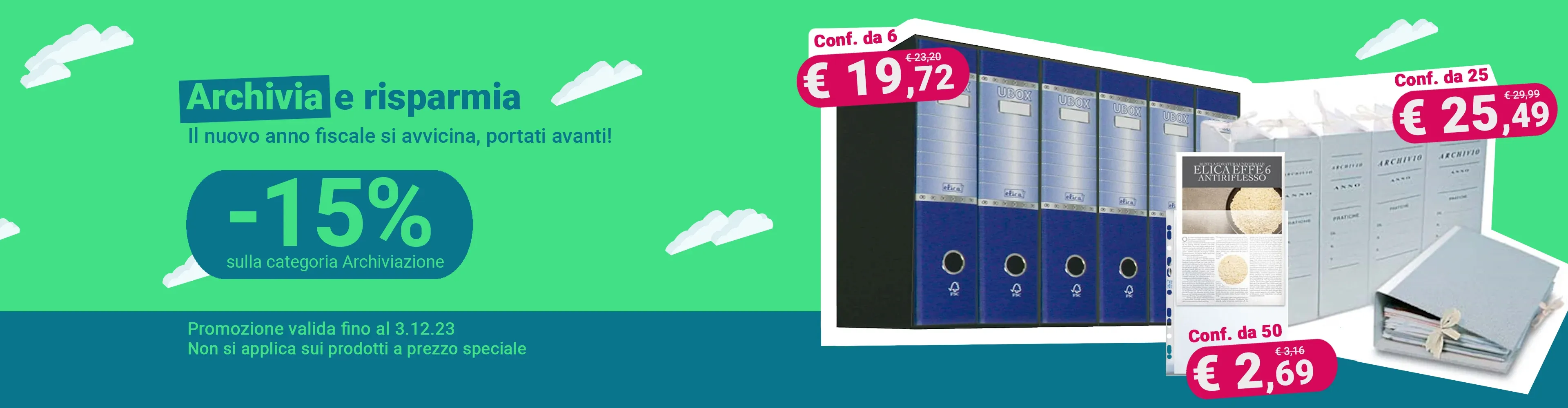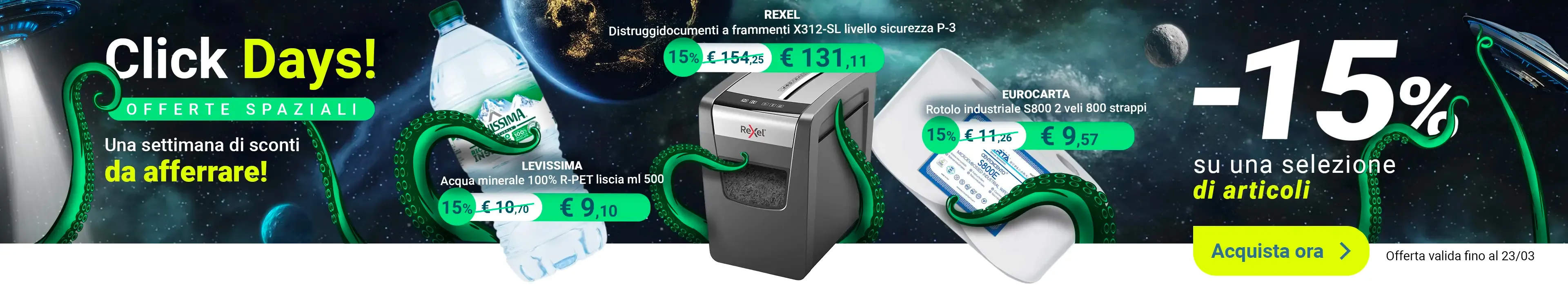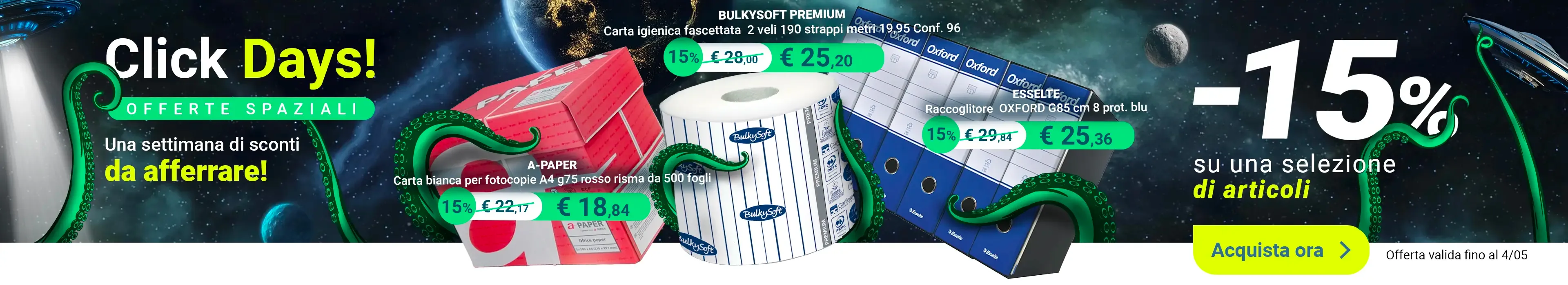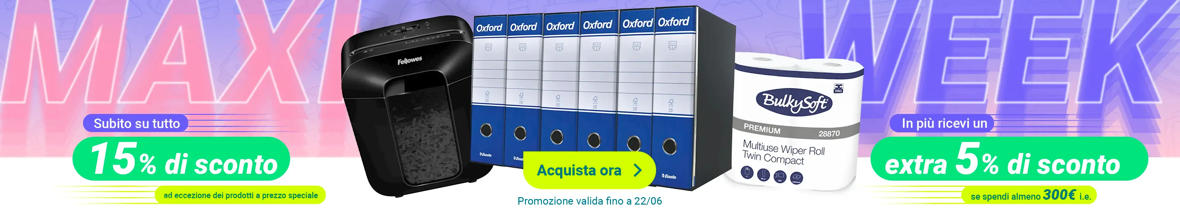 Acquistare su ClickUfficio non solo vi permette di accedere a prodotti cancelleria e forniture da ufficio a prezzi concorrenziali, ma vi offre anche la possibilità di usufruire di promozioni speciali e sconti riservati agli acquisti all’ingrosso. La nostra piattaforma è ottimizzata per garantire un'esperienza di acquisto veloce e sicura, con diverse opzioni di pagamento disponibili, tutte pensate per garantire la massima flessibilità.