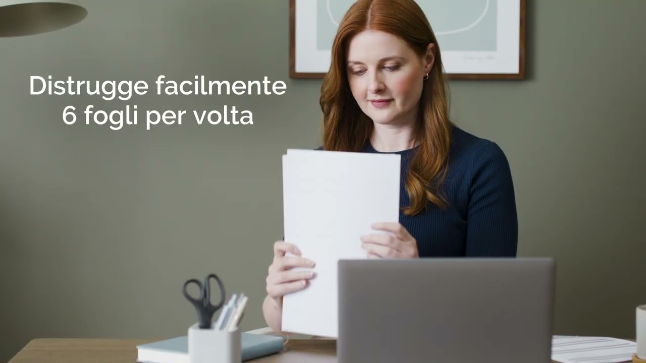 Distruggidocumenti per uso leggero a casa od in ufficio. Distrugge 6 fogli per volta, livello sicurezza P4. Blocco di sicurezza per evitare accensioni accidentali. Distrugge ininterrottamente per 5 minuti con tempo di raffreddamento di 30 minuti. Comodo cestino da 11,5 lt con testa sollevabile. Distrugge graffette, punti metallici e carte di credito.