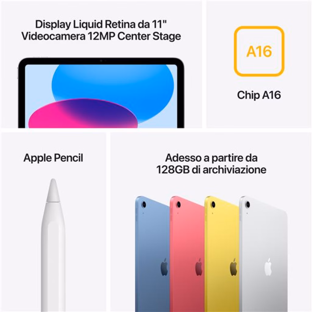 Il meraviglioso display Liquid Retina è un modo straordinario per guardare film o disegnare il tuo prossimo capolavoro. True Tone regola il display in base alla temperatura del colore della stanza per rendere la visione confortevole con qualsiasi luce. Il velocissimo chip A16 offre prestazioni migliori per le tue attività preferite. E con una batteria che dura tutto il giorno, l'iPad è perfetto per giocare a giochi coinvolgenti e modificare foto e video. L'iPad è dotato di una fotocamera frontale Center Stage da 12 MP, perfetta per le videochiamate e i selfie. La fotocamera posteriore Wide da 12 MP è perfetta per la scansione di documenti e l'acquisizione di foto e video 4K. Touch ID è integrato nel pulsante superiore, quindi puoi usare l'impronta digitale per sbloccare l'iPad, accedere alle app ed effettuare pagamenti in modo sicuro con Apple Pay.