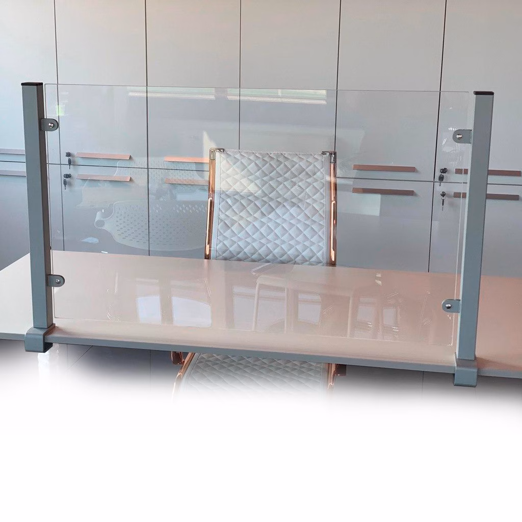 Peretina L130 regolabile in altezza (min.60cm max 70cm ( tra piano e plexiglass min. 3cm max 13cm). Telaio con 2 montanti laterali sezione 35x35 in acciaio verniciato grigio chiaro e pannello di plexiglass trasparente spessore 5 mm + N° 2 supporti laterali. Fornito già montato in scatola e pronto alluso. Con adesivi di segnalazione del vetro allinterno della scatola. Versione con fissaggio al piano tramite morsetti oppure in appoggio tramite basette con biadesivo compreso.