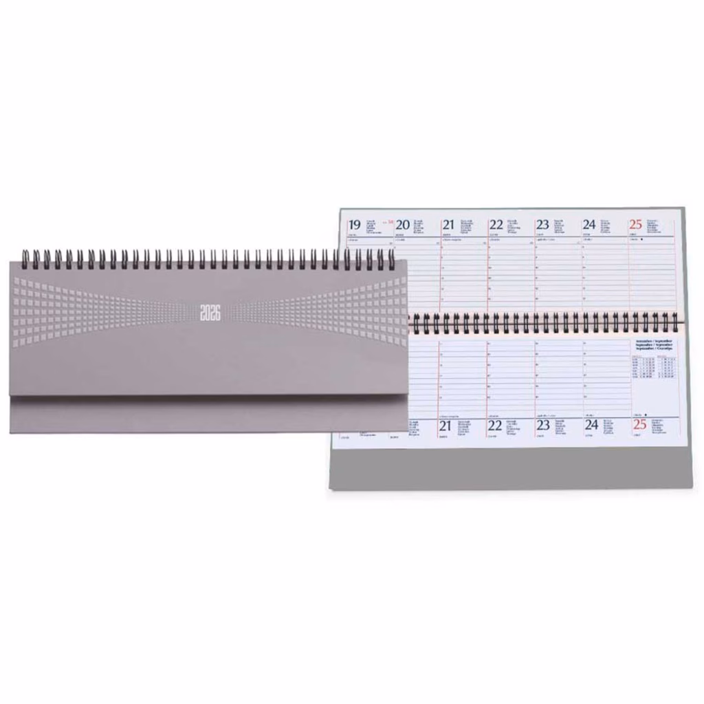 Agenda da tavolo con rilegatura a spirale metallica - copertina rigida in materiale Matra - 128 pagine versione settimanale (stessa settimana su due pagine) stampate a 2 colori su carta usomano bianca da 70 g/m2 - rubrica telefonica - edizione multilingue - formato fogli cm 30x11,5 - formato esterno cm 30x15