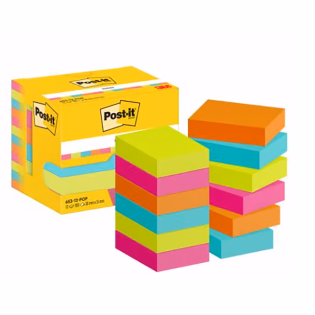 Foglietti Post-it® Poptimistic, 12 blocchetti da 100 fogli ognuno, 38 mm x 51 mm, colori rosa power, verde acido, blu e arancio acceso