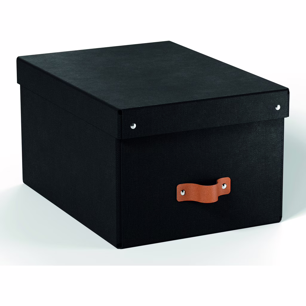 Set di due scatole portaoggetti con coperchio, realizzate in cartone 100% riciclato. Vengono fornite piatte e si assemblano facilmente e rapidamente. Sono impilabili per ottimizzare lo spazio e perfette per conservare documenti e altri oggetti. Dotate di una maniglia in pelle per facilitarne l'estrazione da scaffali e mobili. Possono essere completamente smontate per un riciclo totale a fine utilizzo.