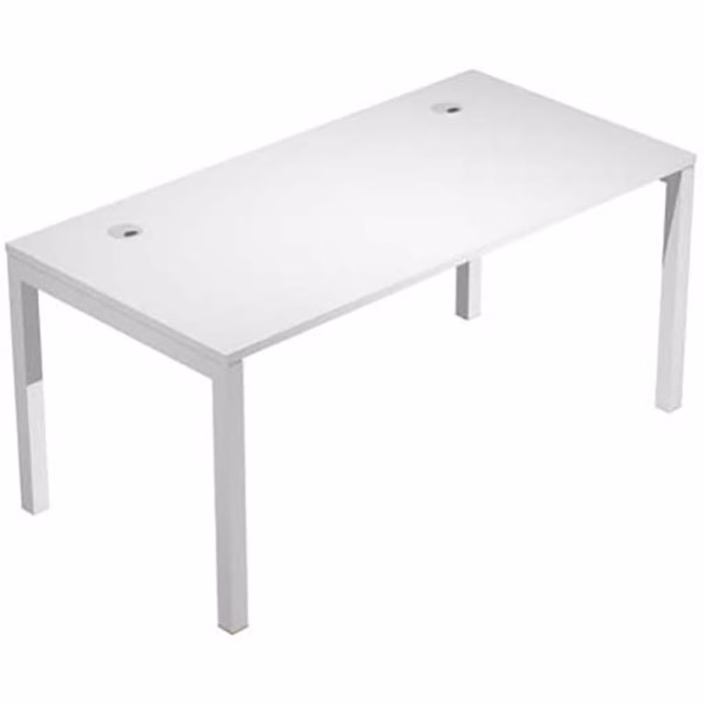 Scrivania dimensioni cm L160xP80xH73. Piano in agglomerato ligneo nobilitato melaminico sp.25mm, bordato in abs sp.2 mm. Struttura in metallo, con solida gamba di sezione 50x50 mm, finitura bianca. Piano di lavoro fornito di due passacavi diametro 80 mm per favorire canalizzazione. Finitura piano bianco