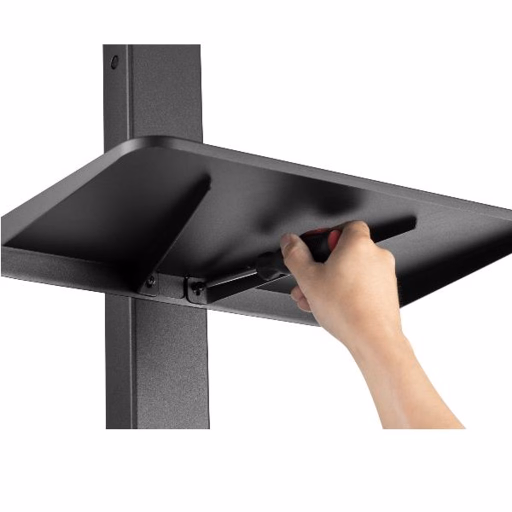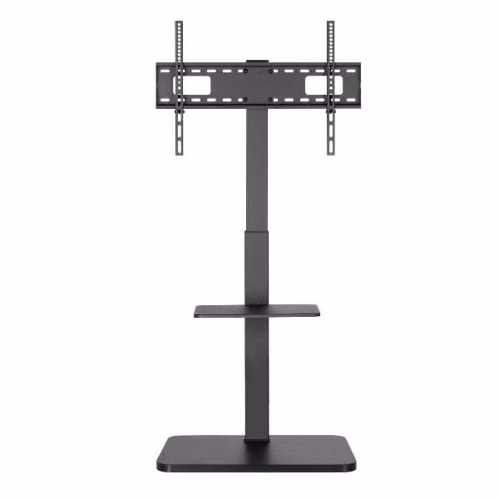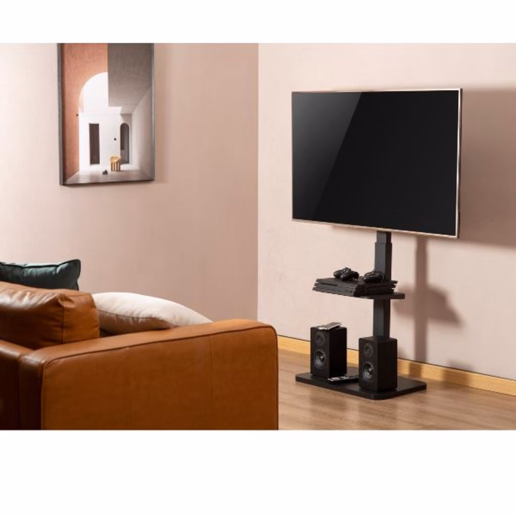 Questo supporto da pavimento per TV è perfetto per i luoghi privi di opzioni di montaggio. Realizzato con una solida struttura in acciaio e una base in laminato melaminico con finitura in legno per riporre e mostrare, girevole, regolabile in altezza, organizzabile, facile da montare e con cavi gestibili.
