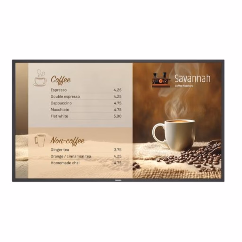 Autonomia 24 ore su 24, 7 giorni su 7 Con una luminosità di 800 cd/m2 per una migliore visibilità in condizioni di illuminazione ambientale intensa, le soluzioni di signage Philips Serie 6000 sono progettate per un utilizzo continuo, 24 ore su 24, 7 giorni su 7, rendendola una scelta eccellente per hub di viaggio e di trasporto, centri commerciali, locali di ristorazione e molto altro ancora. Controllo tramite Philips Wave Grazie al nostro chipset dal design esclusivo, è possibile controllare a distanza gli elementi del display con Philips Wave, progettato per garantire efficienza in termini di tempo, energia e costi. Questa versione speciale di Wave consente di accedere, gestire e limitare in modo sicuro le impostazioni del display per la regolazione di volume, luminosità, modalità standby e alimentazione, senza bisogno di un SoC Android.