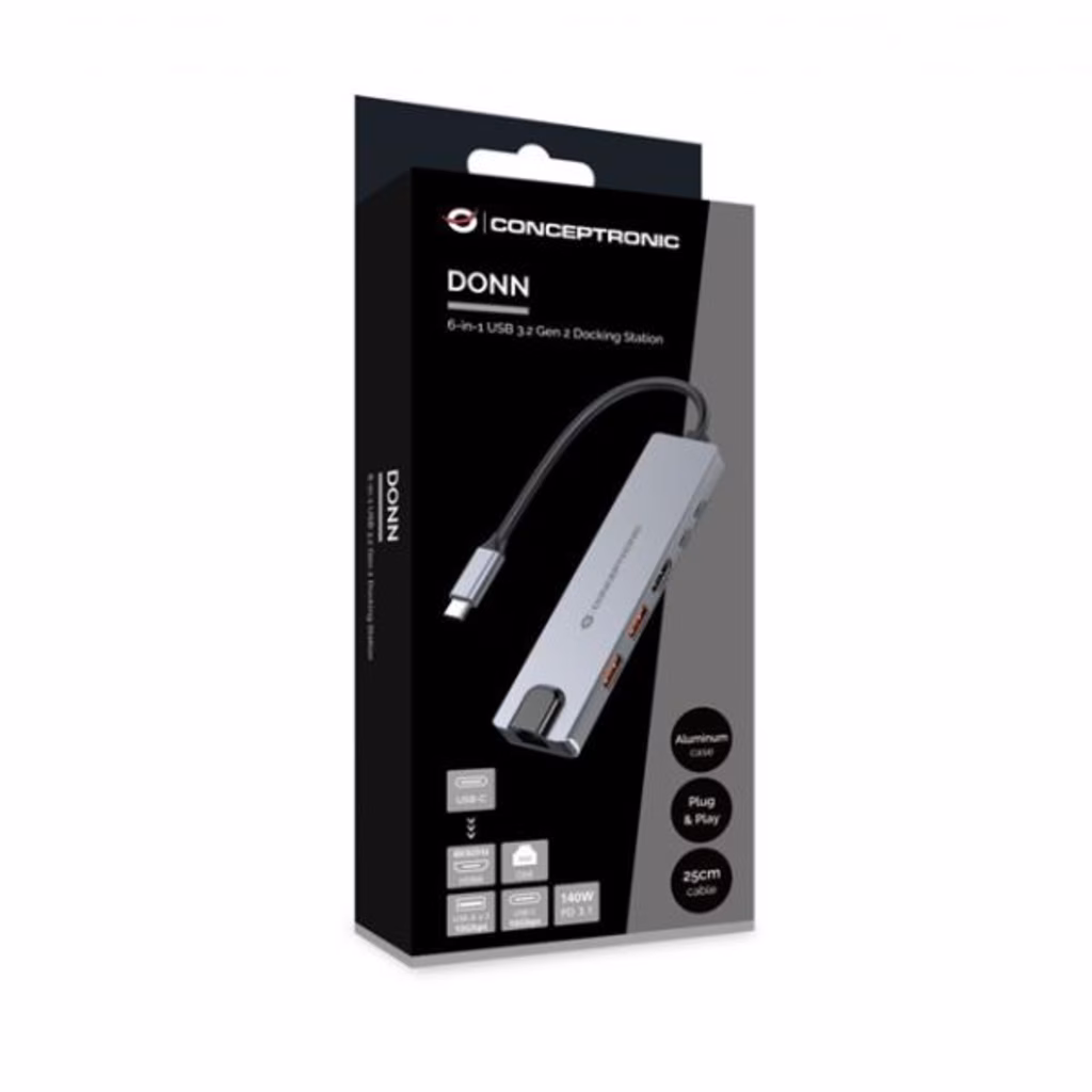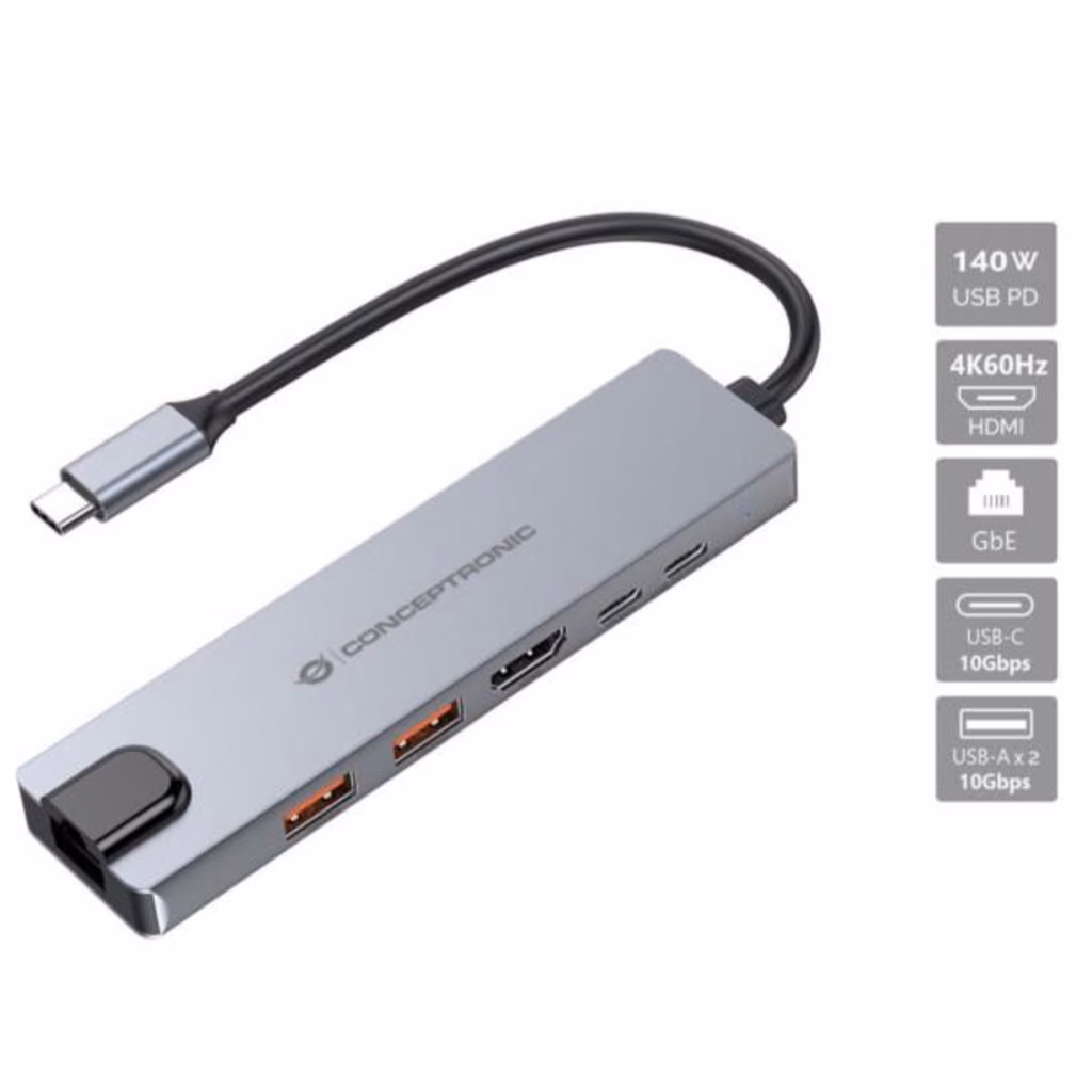 Questa docking station 6-in-1 espande la funzionalità USB Type-C del dispositivo con porte HDMI, USB-C PD, USB-C (10Gbps), USB-A (10Gbps) e RJ45. È una soluzione ideale per i MacBook o i portatili Windows con connettività wireless integrata ma senza porta Ethernet. Dotata di una connessione Gigabit Ethernet, garantisce un accesso alla rete cablata veloce e affidabile. Inoltre, la docking station supporta un'erogazione di energia fino a 140 W per laptop o tablet compatibili con supporto USB-C PD 3.1.