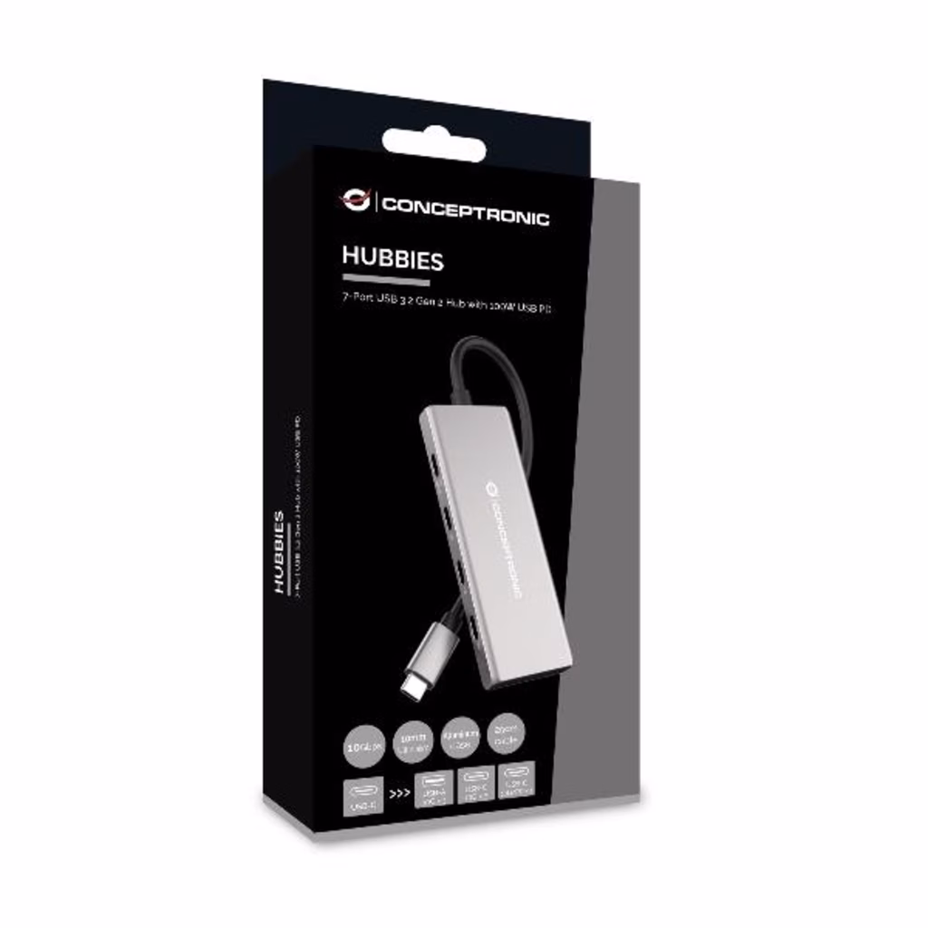 HUBBIES17G consente di aggiungere facilmente fino a 7 periferiche o gadget compatibili con USB al MacBook, al Chromebook Pixel o a qualsiasi altro laptop di ultima generazione con porte USB-C. L'hub offre una trasmissione dati costante ed efficiente, con velocità di trasferimento fino a 10 Gbps. Inoltre, l'hub dispone di una funzione USB Power Delivery (PD) fino a 100W, che garantisce un trasferimento dati veloce e una ricarica efficiente in un'unica soluzione.