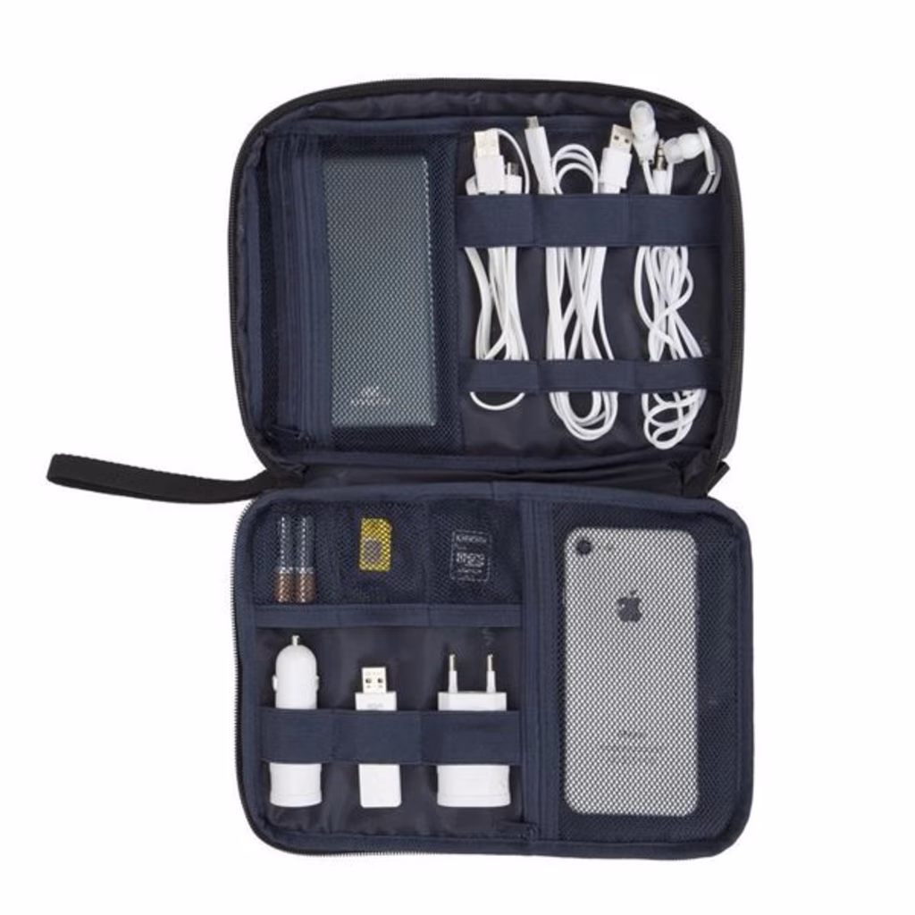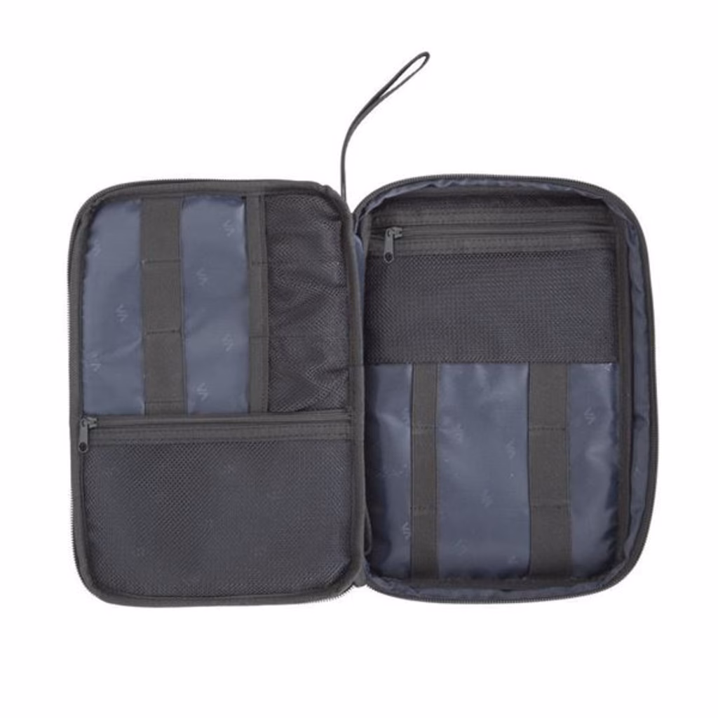Questo versatile organizer Biscayne incarna l'eleganza e l'ordine con i suoi sobri tessuti nero e blu scuro. Per coloro che sono stanchi del caos che spesso insegue nella loro borsa principale, con fili ovunque e dispositivi persi sotto pile di vestiti, questo organizzatore offre la soluzione perfetta