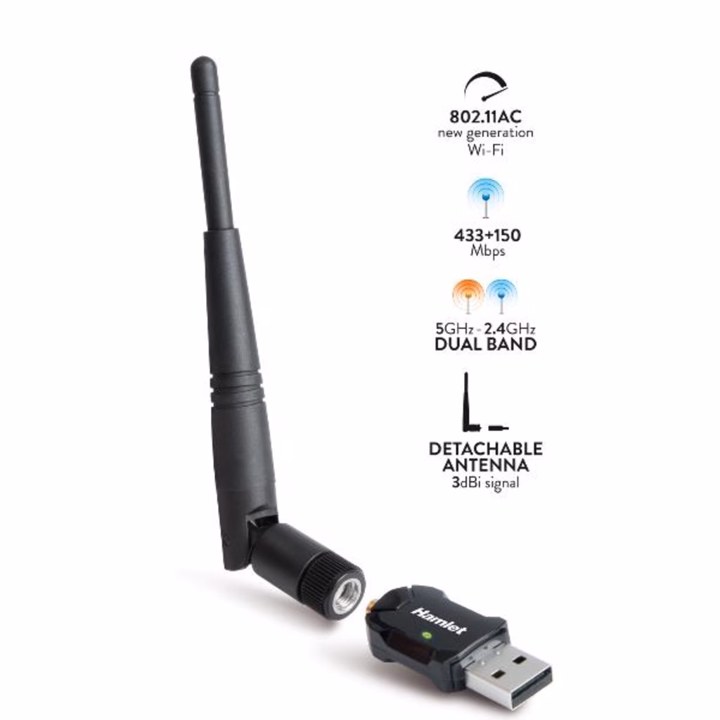 L'adattatore USB Wi-Fi 600AC di Hamlet aggiorna il notebook o il desktop allo standard 802.11ac, la tecnologia wireless di ultima generazione che offre alta velocità e stabilità. Il supporto Dual Band permette connessioni wireless fino a 433Mbps sulla banda a 5GHz, ideale per lo streaming video HD e il gaming online, e velocità fino a 150Mbps sulla frequenza a 2,4GHz per la normale navigazione web, purché anche il router supporti tali velocità.caratteristiche