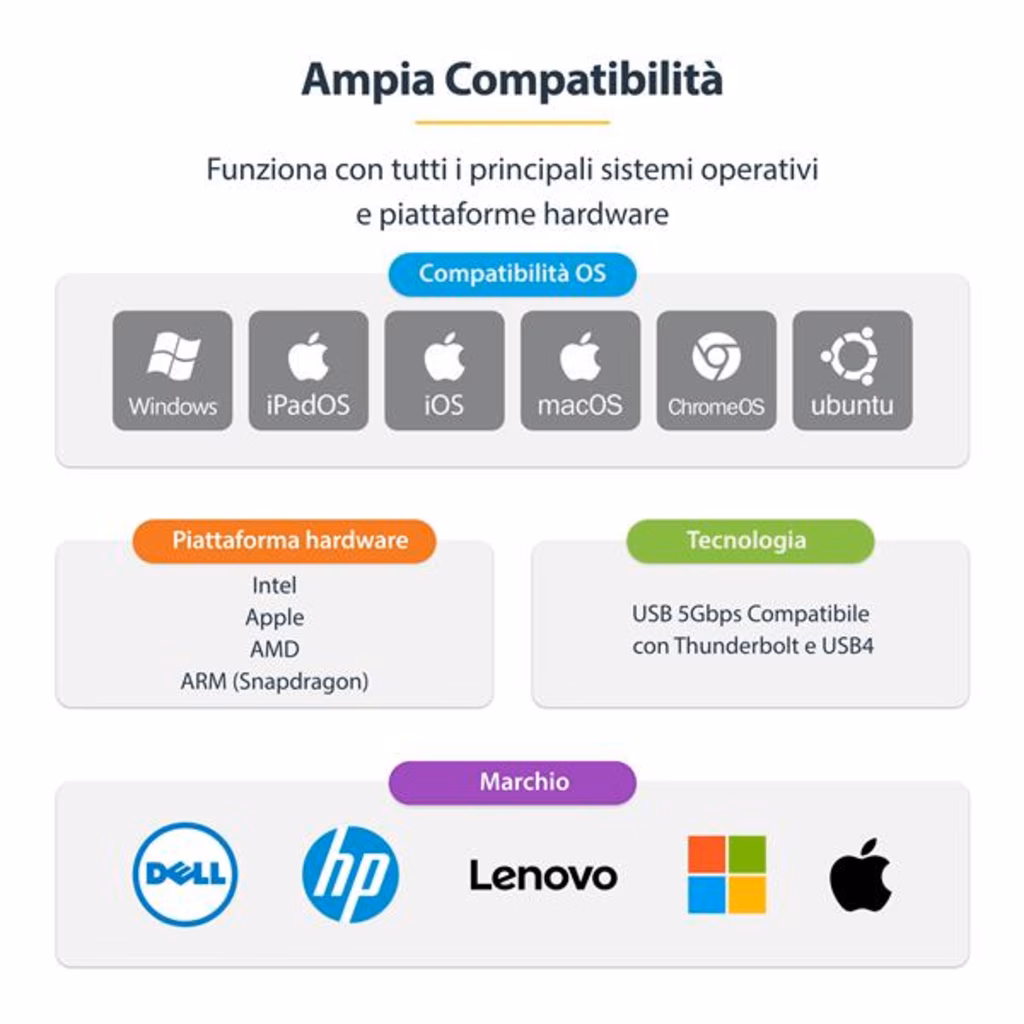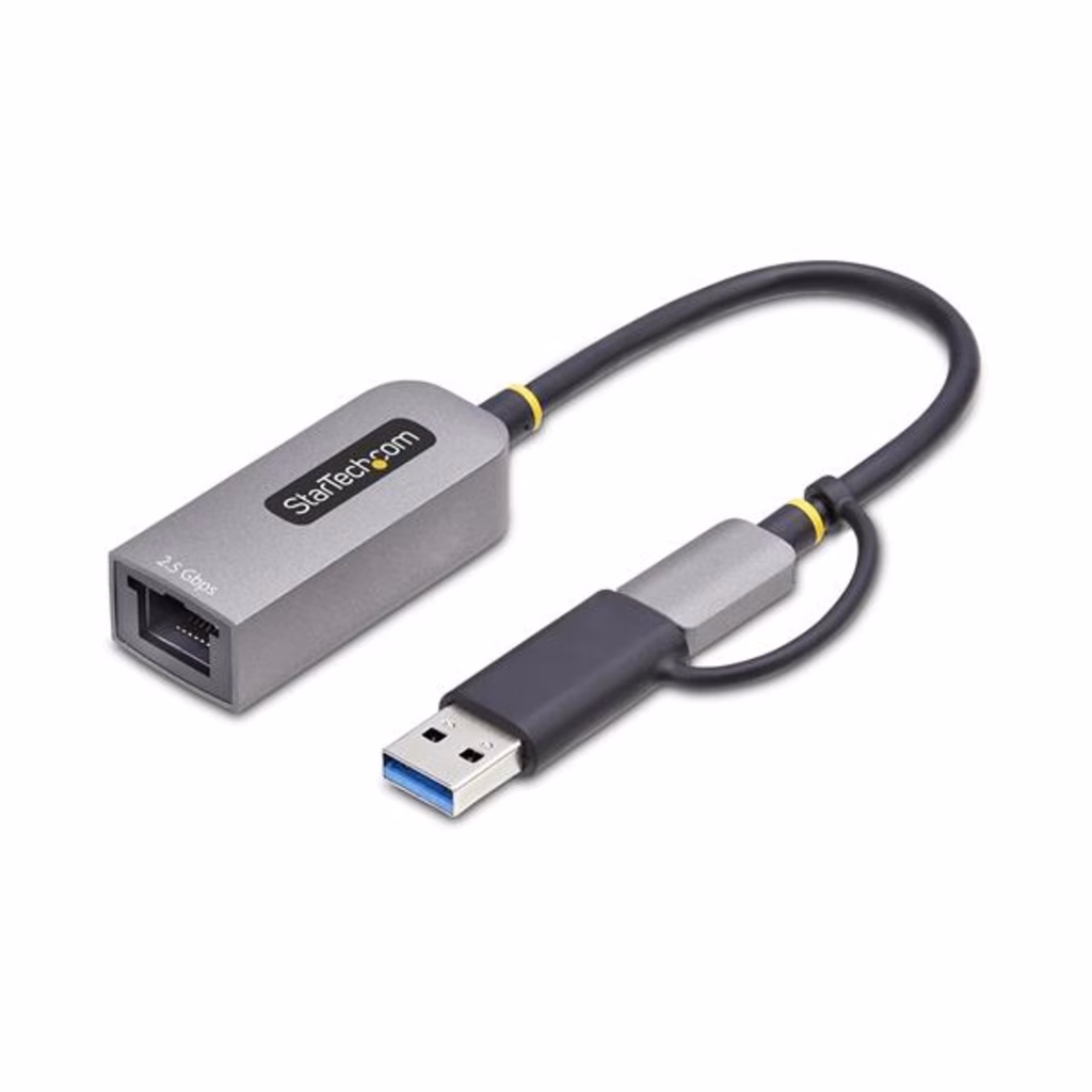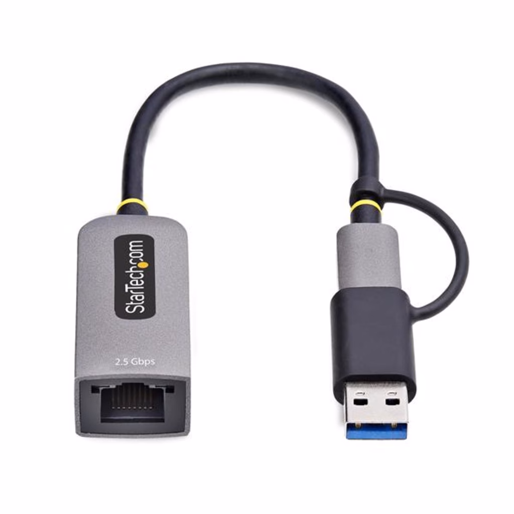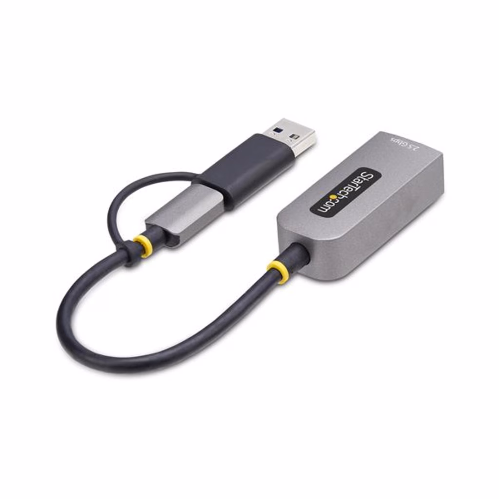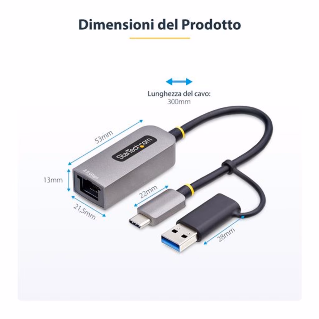 StarTech.com Adattatore Ethernet USB C, Convertitore di Rete/NIC NBASE-T 2.5/1GbE da USB Type-C 3.0 a RJ45 con Adattatore USB-A incluso; Compatibile TB, Win e MacConsente di aggiungere una porta Ethernet da 2,5Gb a MacBook, Chromebook e portatili con porta USB-C o Thunderbolt 3 Questo adattatore Ethernet USB consente di iaggiungere una porta di rete LAN RJ45 fino a 2,5GbE a laptop, tablet o iPhone utilizzando una porta USB Tipo-C o Tipo-A disponibile. Questo convertitore di rete da USB 3.0 Type-C a Gigabit raddoppia le prestazioni di rete anche utilizzando i cavi Cat5e esistenti, senza dover modificare o aggiungere nulla all'impianto di rete esistente. Questa interfaccia di rete è dotata di un cavo USB integrato da 15 cm ed è alimentata tramite bus, prelevando l'energia direttamente dalla porta USB del computer, elimindo in questo modo la necessità di un alimentatore esterno. Connessione di Rete 2,5 Gigabit Questo adattatore dalle dimesioni ridotte è ideale per l'uso in ufficio e per gli hot desk. Consente di scaricare più rapidamente file di grandi dimensioni da una rete, effettuare lo streaming di video, conferenze di maggiore qualità e sincronizzare i file con il cloud in background, senza compromettere le altre attività di navigazione. L'adattatore garantisce connessioni wireless più veloci e sicure, rendendolo ideale per i professionisti IT. Il Supporto del Driver Nativo semplifica l'Installazione È sufficiente collegare questo adattatore da USB-C a Ethernet alla porta USB di un laptop per connettersi a una rete. Il chipset Realtek del convertitore di rete assicura il supporto nativo dei driver per Windows (10/11, ARM supportato), Macbook (MacOS), Chromebook (ChromeOS), Snapdragon, Linux, iPhone e tablet. Tutti i sistemi operativi Windows che non dispongono del driver verranno automaticamente invitati a scaricare il software direttamente dall'adattatore; garantendo un'installazione rapida ed efficace senza necessità di accesso a Internet The StarTech.com Advantage