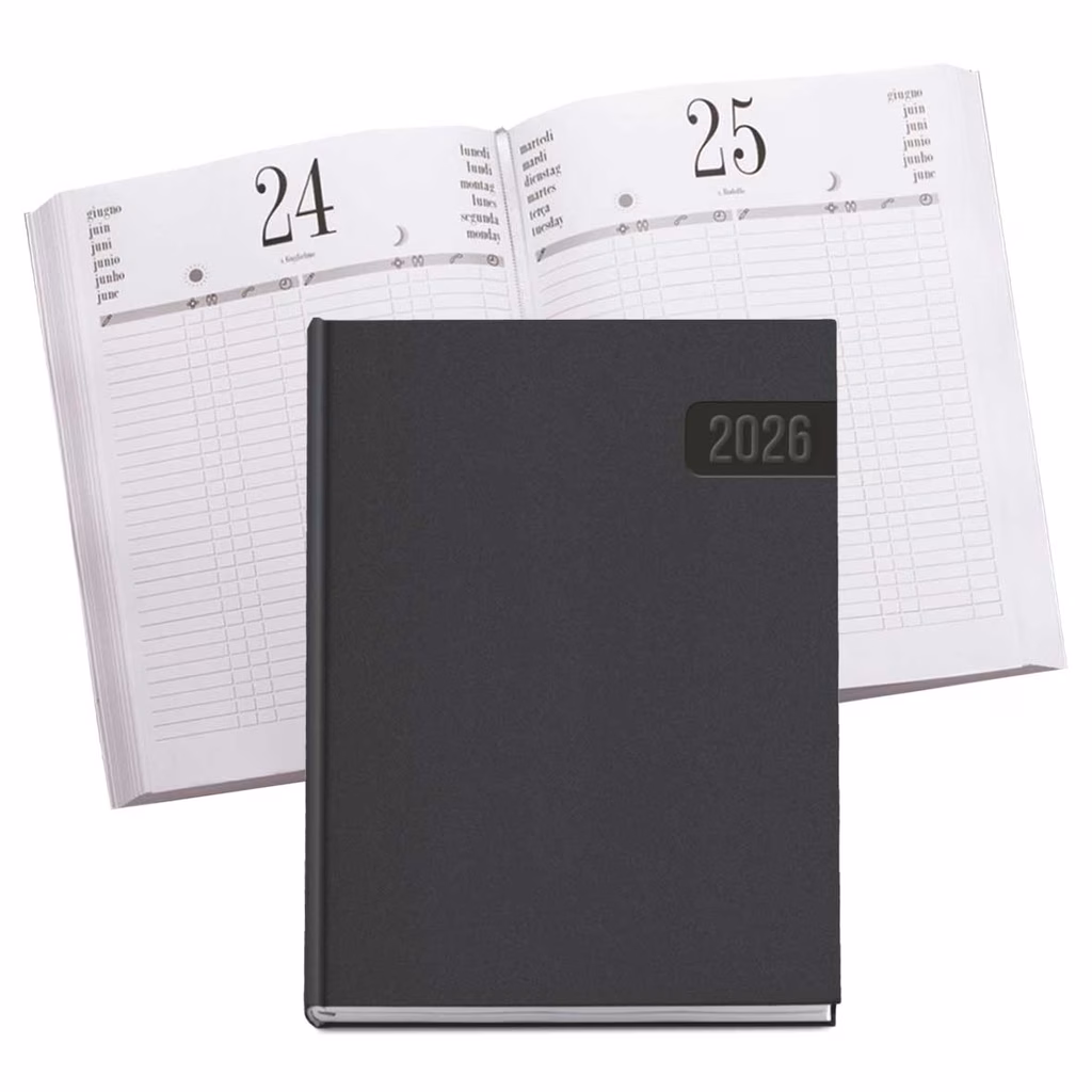 Agenda libro prenotazioni con copertina in poliuretano termovirante - 576 pagine versione giornaliera su carta usomano bianca da 70 g/m2 - venerdì, sabato e festivi in doppia pagina - pagine a strappo verticale singolo con foratura parallela al dorso - segnapagine - rubrica telefonica - edizione multilingue - millesimo stampato a secco - formato chiuso A4 cm 21x29,7