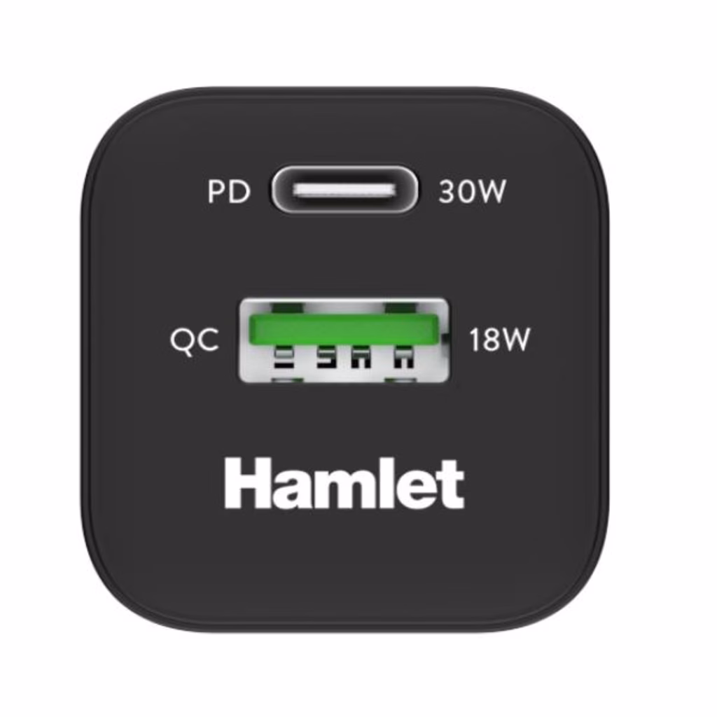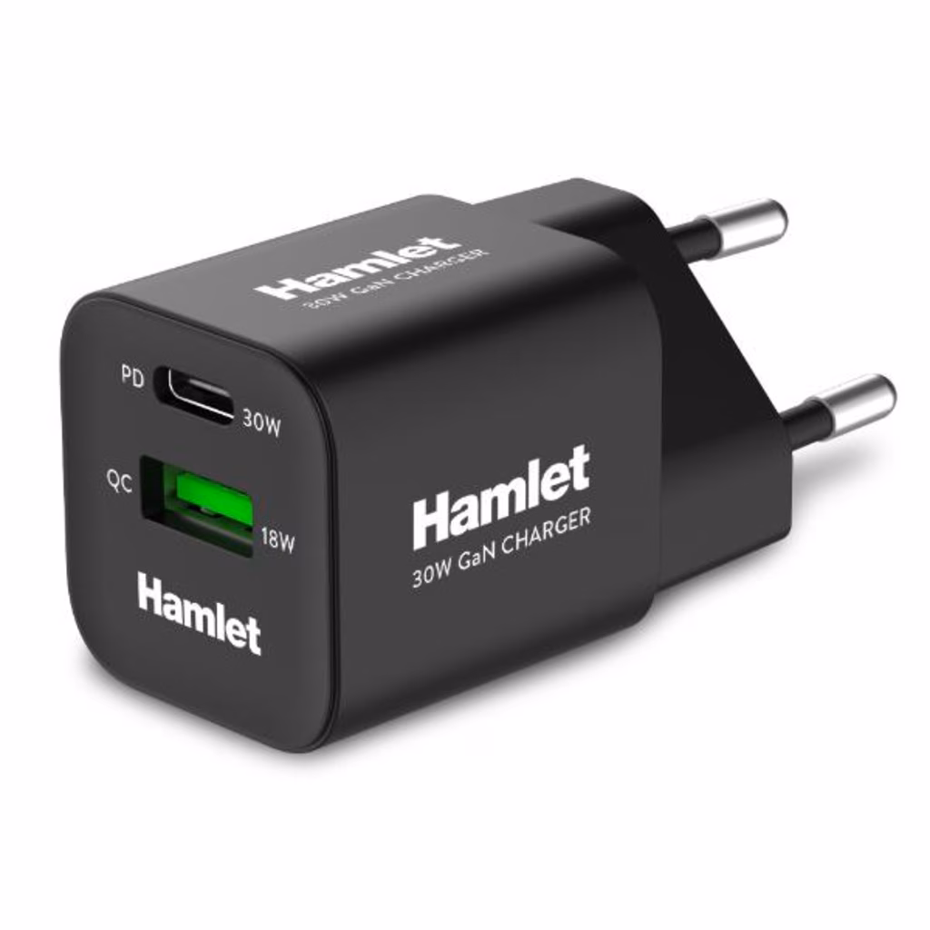 Hamlet GaN Charger è un alimentatore da parete da 30W dotato di tecnologia Power Delivery e Quick Charge. La porta USB-C Power Delivery fornisce una potenza di ricarica di 30W mentre la porta USB-A Quick Charge una potenza massima di 18W. L'alimentatore GaN Charger permette di ricaricare due dispositivi contemporaneamente e offre voltaggi da 5 a 20 Volt, a seconda della porta utilizzata, per ricaricare una vasta gamma di dispositivi. La nuova tecnologia basata sul Nitruro di Gallio (GaN) garantisce più prestazioni e meno ingombri quindi ridotto impatto ambientale a fine vita del prodotto.