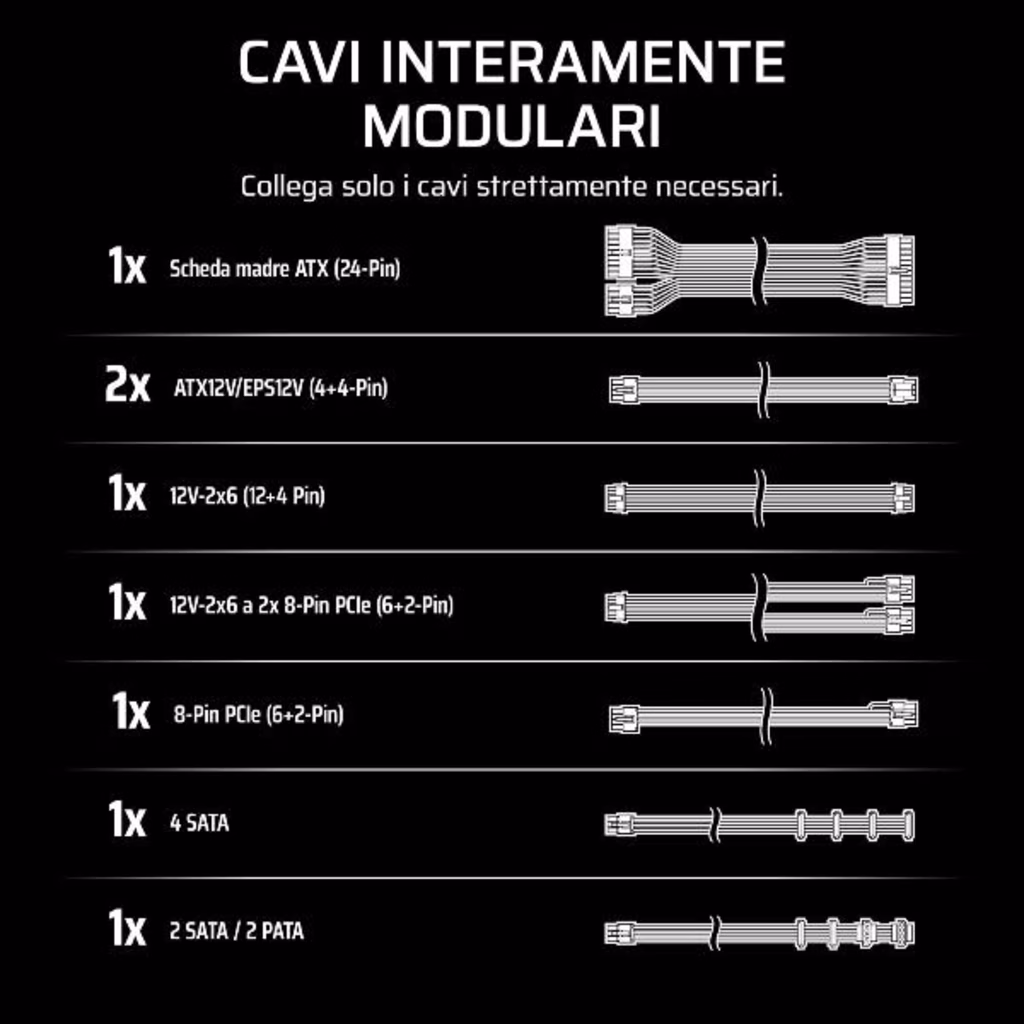 Gli alimentatori CORSAIR RMe Series interamente modulari e a bassa rumorosità includono un cavo di alimentazione per GPU 12V-2x6, sono certificati ATX 3.1 e conformi a PCIe 5.1, e grazie all efficienza Cybenetics Gold hai a disposizione un sistema affidabile e silenzioso.