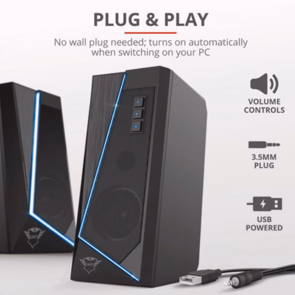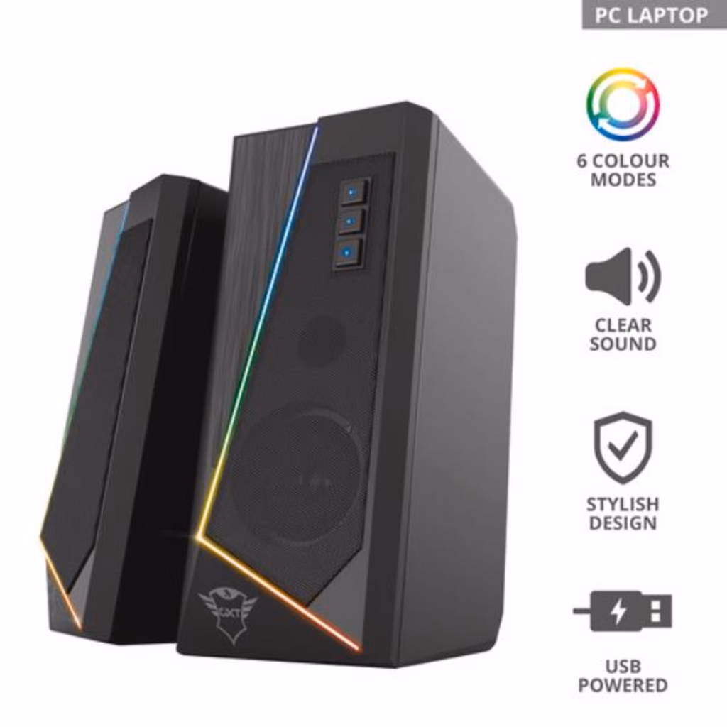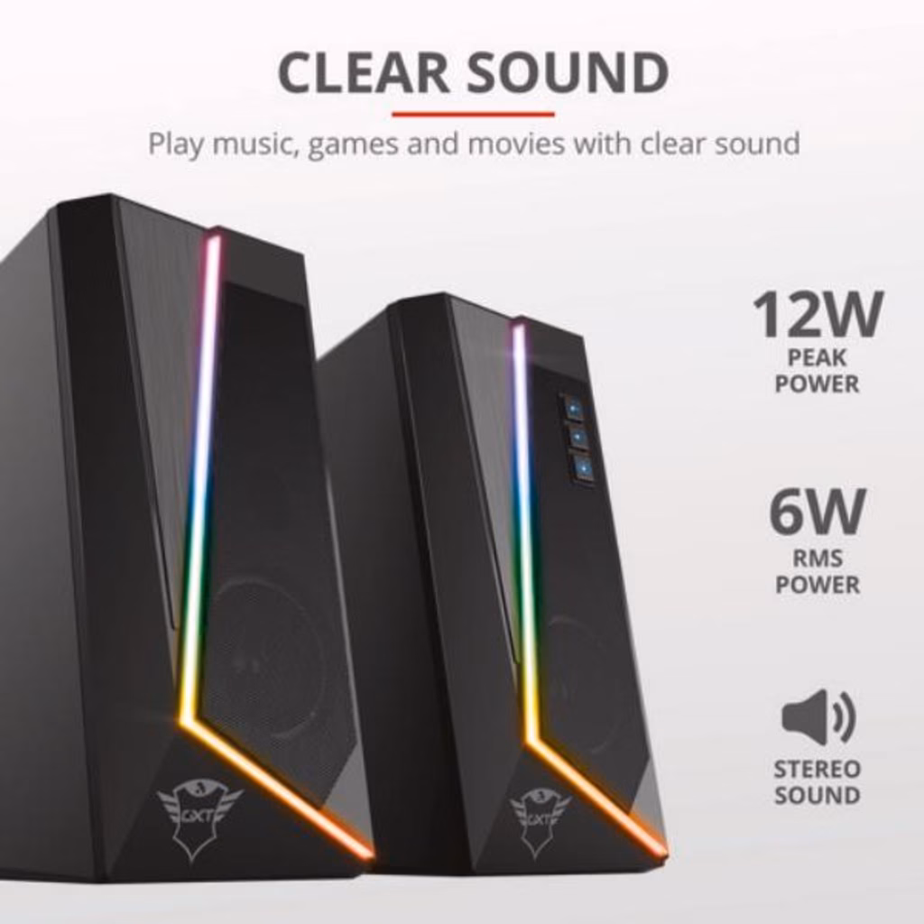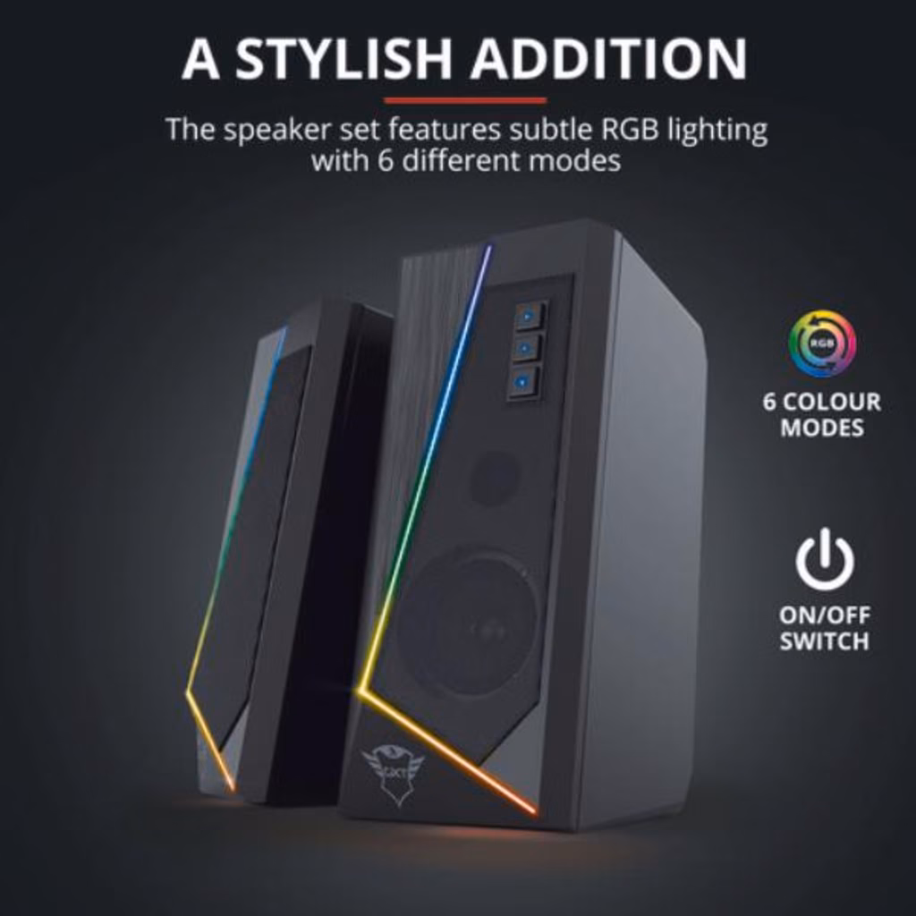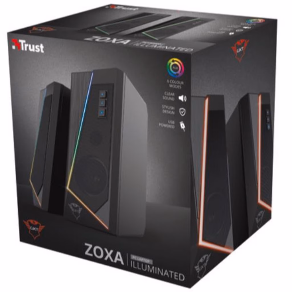 Con il design elegante e moderno, gli altoparlanti Trust Zoxa sono perfetti tanto per l'area di lavoro a casa che per la sala giochi. Ma tu sei un gamer, quindi anche l'occhio vuole la sua parte. Gli altoparlanti Zoxa sono provvisti di luci RGB con 6 diverse modalità. E nonostante il design minimalista, non farti ingannare dall'aspetto.