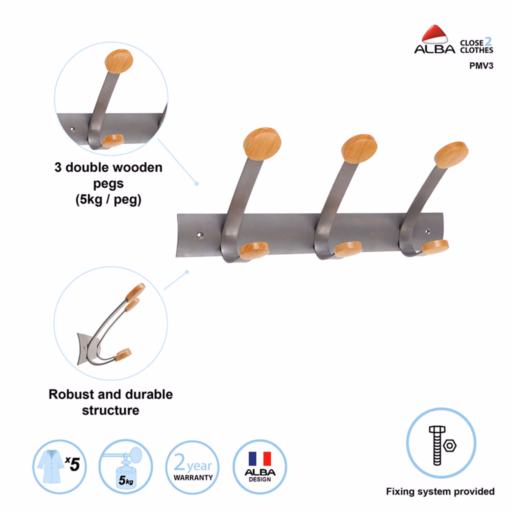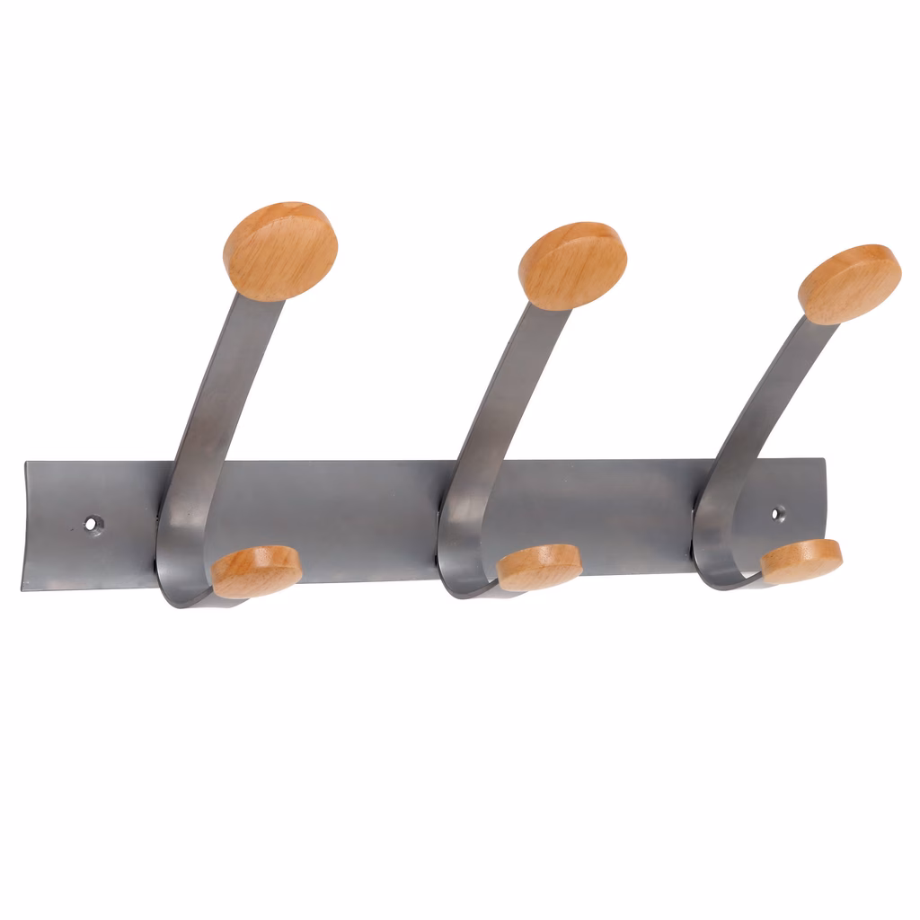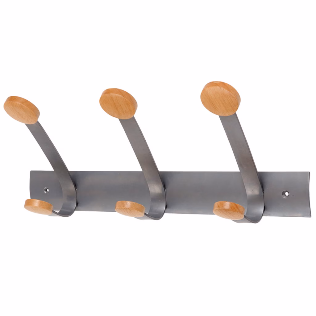 Appendiabiti da parete, elegante design, caratterizzato dalla combinazione di metallo e legno chiaro, con pomoli arrotondati. Facili da assemblare e da fissare al muro per mezzo delle viti in dotazione.