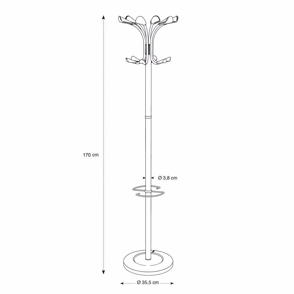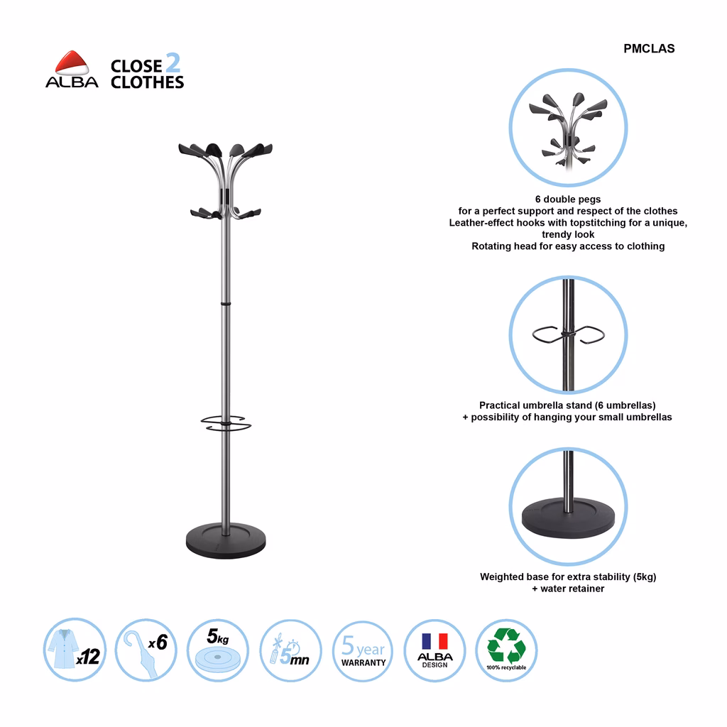 Appendiabiti da terra alto 177 cm.di disegno classico realizzato in acciaio cromato e appendini in ABS neri adatti alla massima cura dei tessuti - La base pesante assicura massima stabilità. Tubo da 38 mm per garantire elevata rigidezza.