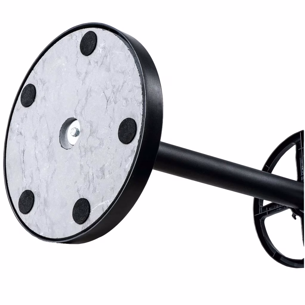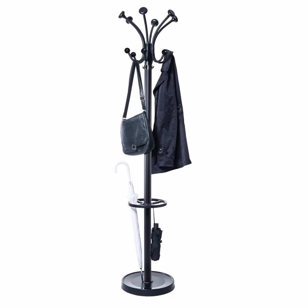 Robusto appendiabiti a stelo in acciaio con appoggio molto sicuro grazie alla base pesante. Rivestimento in plastica e feltro sul lato inferiore per non graffiare i pavimenti. Quattro ganci supplementari sullo stelo, per indumenti leggeri o accessori e altri 4 ganci al portaombrelli, per ombrelli pieghevoli. Sicuro: i pomelli in plastica arrotondati non rovinano gli indumenti. Pomelli avvitati, ben fissi, non traballanti. Si abbina con qualsiasi tipo di arredamento. Altezza 176 cm. Base Ø 36,5 cm.