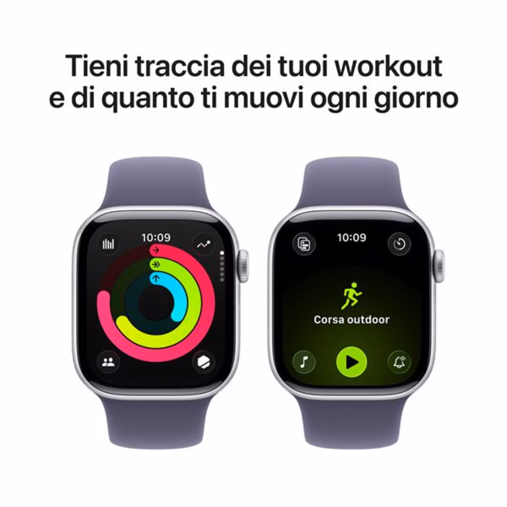 Apple Watch Series 11 GPS 42mm Cassa Alluminio Argento con Sport Band Viola Nebbia - M/LRicevi informazioni preziose sulla tua salute Apple Watch Series 11 ti offre informazioni preziose sulla tua salute, con notifiche in caso di frequenza cardiaca troppo alta o troppo bassa e dati sulla qualità del sonno. Migliora la tua forma fisica con parametri evoluti per tutti i tuoi allenamenti. E goditi fino a 24 ore di batteria. Caratteristiche principali - QUALITÀ DEL SONNO Un nuovo parametro che ti aiuta a controllare come dormi e a riposarti meglio. - ANCORA PIÙ INFORMAZIONI SULLA TUA SALUTE Ricevi notifiche se la frequenza cardiaca è troppo alta o troppo bassa, accedi ai dati sanitari raccolti mentre dormi nell app Parametri Vitali e misura il livello di ossigeno nel sangue. - DESIGN SPETTACOLARE Sottile e leggero, Series 11 è comodo da indossare tutto il giorno e anche mentre dormi, così puoi monitorare i tuoi parametri vitali 24 ore su 24. - IL TUO COMPAGNO DI FITNESS IDEALE Parametri evoluti per tutti i tuoi allenamenti, funzioni come Ritmo definito, Zone di frequenza cardiaca e Carico di allenamento, e molto altro. In più, con Series 11 hai tre mesi gratis di Apple Fitness+. - TANTA AUTONOMIA IN PIÙ Fino a 24 ore di utilizzo normale.1 E ricarica rapida per avere fino a 8 ore di utilizzo normale in soli 15 minuti. - FATTO PER DURARE Display ultrarobusto con vetro due volte più resistente ai graffi rispetto a Series 10. Resistenza all acqua fino a 50 m e resistenza alla polvere di grado IP6X. - FUNZIONI PER LA SICUREZZA Se hai avuto una brutta caduta o un grave incidente d auto, Series 11 può accorgersene, aiutarti a chiamare i soccorsi e inviare una notifica ai tuoi contatti di emergenza. Invece, la funzione Tutto bene , può automaticamente avvisare una persona cara appena arrivi a destinazione. - SEMPRE IN CONTATTO Manda messaggi, rispondi a una chiamata, ascolta musica, usa Siri e leggi le notifiche. Insieme al tuo iPhone o sotto rete Wi-Fi, Series 11 (GPS) ti tiene in contatto col mondo.Il massimo per una vita più sana.Apple Watch può fare cose che gli altri dispositivi nemmeno si sognano, perché è sempre con te. Quando lo indossi, hai subito dati utili sulla salute, un compagno di fitness che misura ogni tuo movimento, funzioni per la sicurezza, e un sacco di modi per rimanere in contatto con le persone e le cose a cui tieni.SaluteBuonanotte. Sarà un buon giorno.