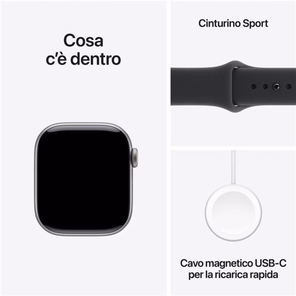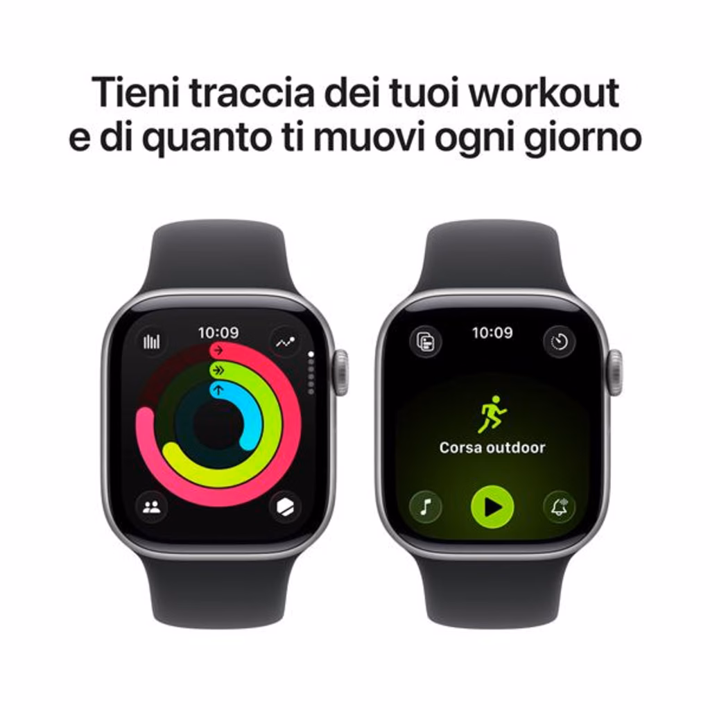 Apple Watch Series 11 GPS 42mm Cassa Alluminio Grigio Siderale con Sport Band Nero - M/LRicevi informazioni preziose sulla tua salute Apple Watch Series 11 ti offre informazioni preziose sulla tua salute, con notifiche in caso di frequenza cardiaca troppo alta o troppo bassa e dati sulla qualità del sonno. Migliora la tua forma fisica con parametri evoluti per tutti i tuoi allenamenti. E goditi fino a 24 ore di batteria. Caratteristiche principali - QUALITÀ DEL SONNO Un nuovo parametro che ti aiuta a controllare come dormi e a riposarti meglio. - ANCORA PIÙ INFORMAZIONI SULLA TUA SALUTE Ricevi notifiche se la frequenza cardiaca è troppo alta o troppo bassa, accedi ai dati sanitari raccolti mentre dormi nell app Parametri Vitali e misura il livello di ossigeno nel sangue. - DESIGN SPETTACOLARE Sottile e leggero, Series 11 è comodo da indossare tutto il giorno e anche mentre dormi, così puoi monitorare i tuoi parametri vitali 24 ore su 24. - IL TUO COMPAGNO DI FITNESS IDEALE Parametri evoluti per tutti i tuoi allenamenti, funzioni come Ritmo definito, Zone di frequenza cardiaca e Carico di allenamento, e molto altro. In più, con Series 11 hai tre mesi gratis di Apple Fitness+. - TANTA AUTONOMIA IN PIÙ Fino a 24 ore di utilizzo normale.1 E ricarica rapida per avere fino a 8 ore di utilizzo normale in soli 15 minuti. - FATTO PER DURARE Display ultrarobusto con vetro due volte più resistente ai graffi rispetto a Series 10. Resistenza all acqua fino a 50 m e resistenza alla polvere di grado IP6X. - FUNZIONI PER LA SICUREZZA Se hai avuto una brutta caduta o un grave incidente d auto, Series 11 può accorgersene, aiutarti a chiamare i soccorsi e inviare una notifica ai tuoi contatti di emergenza. Invece, la funzione Tutto bene , può automaticamente avvisare una persona cara appena arrivi a destinazione. - SEMPRE IN CONTATTO Manda messaggi, rispondi a una chiamata, ascolta musica, usa Siri e leggi le notifiche. Insieme al tuo iPhone o sotto rete Wi-Fi, Series 11 (GPS) ti tiene in contatto col mondo.Il massimo per una vita più sana.Apple Watch può fare cose che gli altri dispositivi nemmeno si sognano, perché è sempre con te. Quando lo indossi, hai subito dati utili sulla salute, un compagno di fitness che misura ogni tuo movimento, funzioni per la sicurezza, e un sacco di modi per rimanere in contatto con le persone e le cose a cui tieni.SaluteBuonanotte. Sarà un buon giorno.