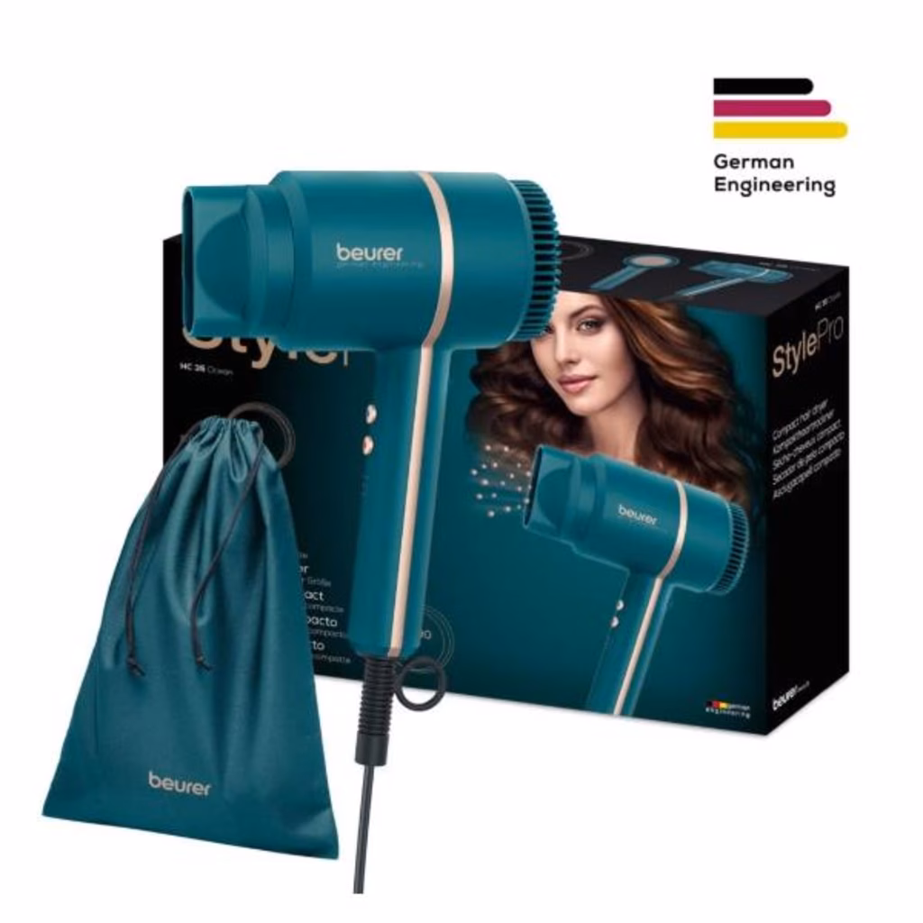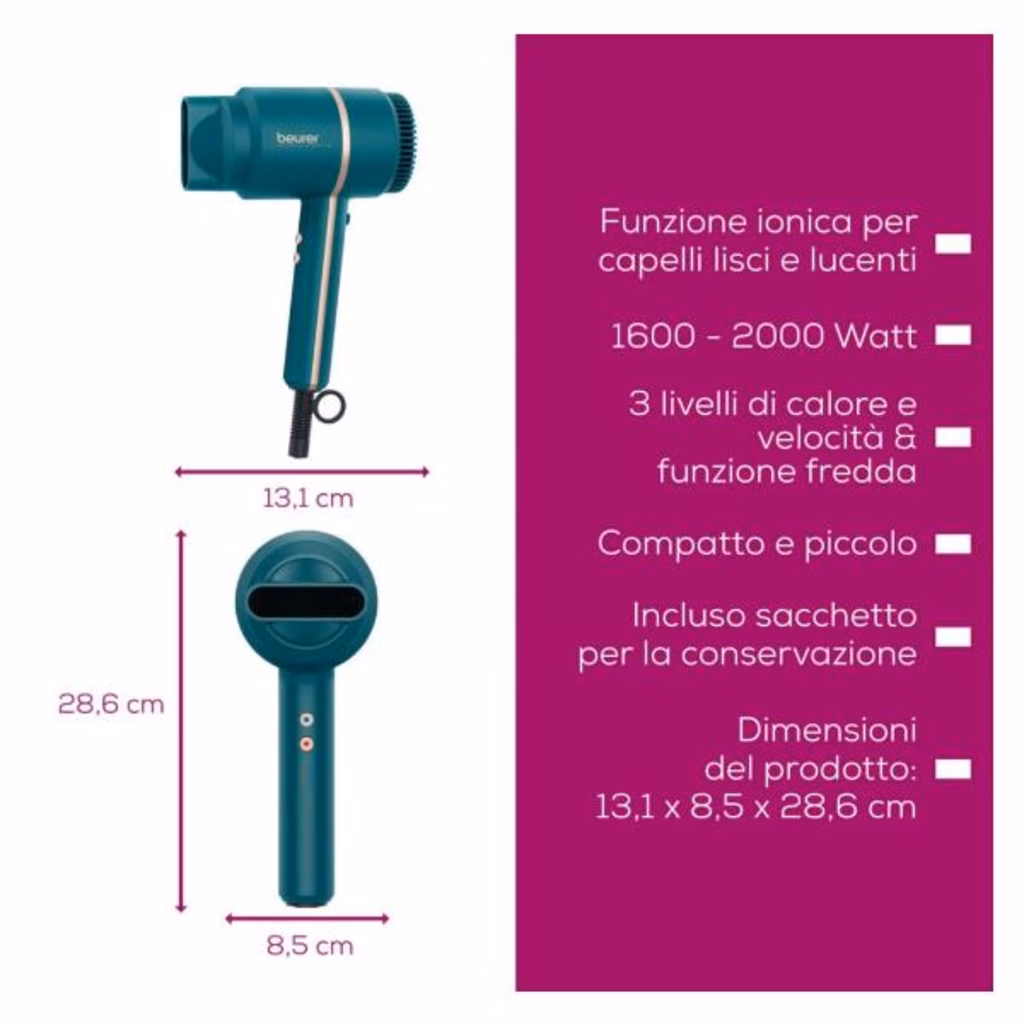 ASCIUGACAPELLI HC35 2000WL'asciugacapelli HC 35 Ocean di Beurer, potente ma compatto, convince per il design moderno color turchese ed è un elemento di spicco in ogni bagno. Con la pratica custodia è possibile riporre rapidamente l'asciugacapelli in un mobile o in una borsa da viaggio.