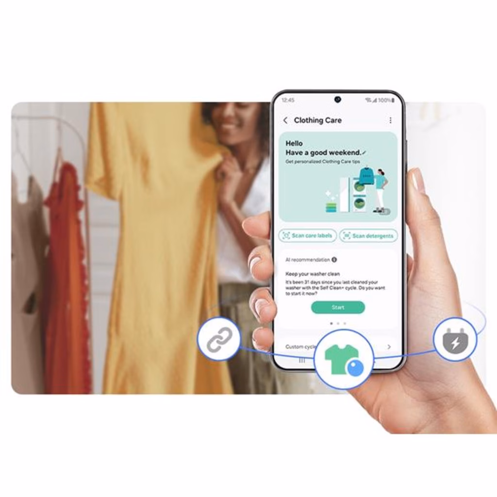 Il modo più semplice ed efficace per usare la tua asciugatrice. L'app SmartThings[4] utilizza i dati acquisiti durante le interazioni con gli utenti per migliorare le prestazioni di asciugatura. E con la funzione Delay End potrai ottimizzare la tua programmazione giornaliera. Inoltre, se la lavatrice e l'asciugatrice sono connesse, la funzione Auto Cycle Link[5] seleziona il programma di asciugatura ideale in base al lavaggio.SmartThings Clothing CareLavaggio su misura. Il modo più semplice per fare il bucato.
