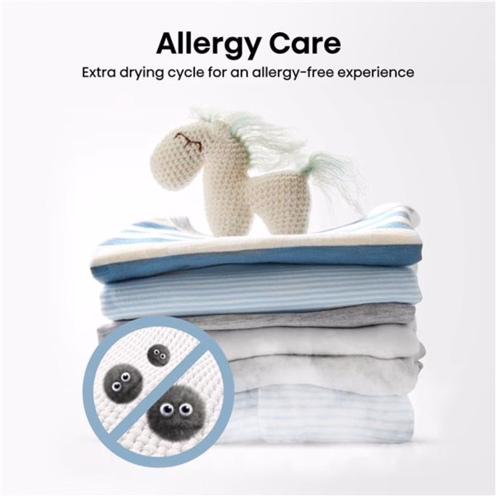 Allergy CareProteggi la tua pelle con la funzione Allergy Care che sfrutta il semplice potere dell'aria calda e un ciclo di asciugatura più lungo per rimuovere efficacemente gli allergeni dagli indumenti, rendendoli completamente puliti e piacevoli da indossare evitando di irritare la pelle.