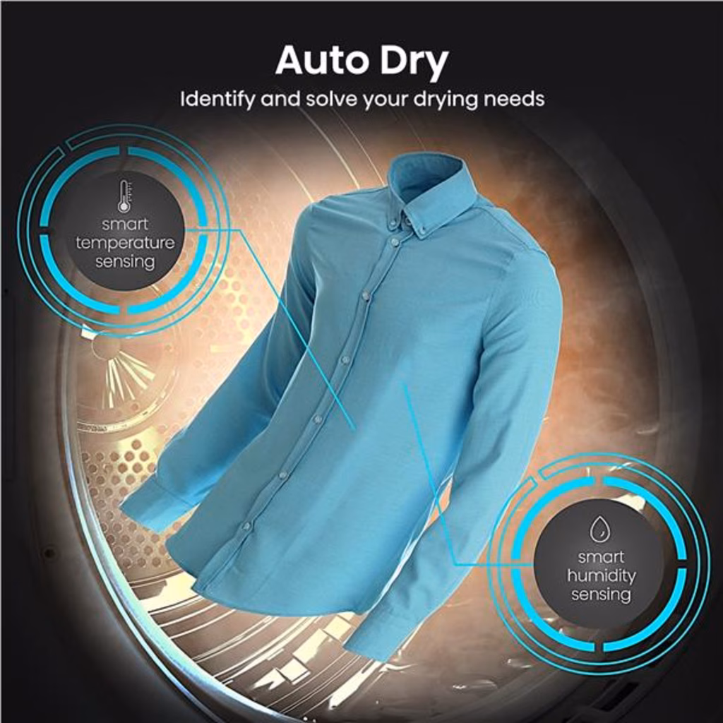 Auto DryIl sensore ad alta precisione integrato, il monitoraggio preciso dell acqua residua e della temperatura, la regolazione automatica del tempo di asciugatura ti assicurano di risparmiare tempo ed energia, evitando danni eccessivi agli indumenti.
