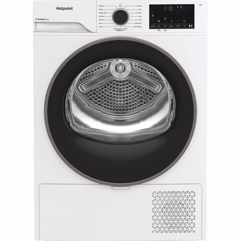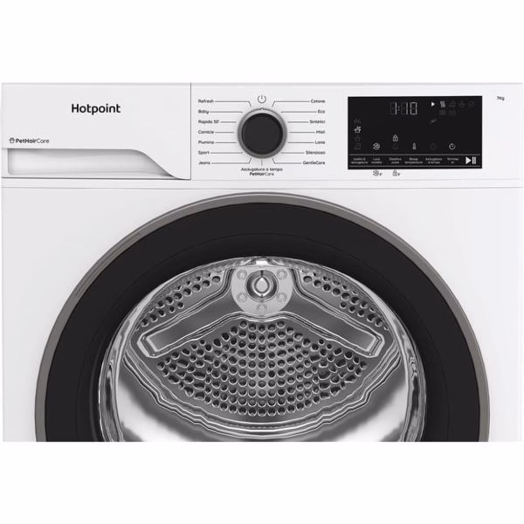 Hotpoint Ariston HPTS 74D BS IT, Capacità 7kg, classe C, EasyIron, Slim, PetHair Removal - Profondità mobile 46 cmCaratteristiche di questa asciugatrice a libera installazione Hotpoint Ariston: cestello spazioso da 7,0 kg.PethaircarePetHairCare è una funzione innovativa a vapore, progettata specificamente per eliminare i peli degli animali domestici. Garantisce un bucato fresco e pulito, libero dai peli più ostinati, pur rimanendo delicata sui tuoi capi.GentlecareIl programma GentleCare è progettato per proteggere i tuoi capi delicati - dalle camicie alla lingerie - con un asciugatura delicata a basse temperature.Asciugatrice slimL'asciugatrice slim di Whirlpool offre un design salvaspazio che ti consente di godere di prestazioni di asciugatura elevate anche in ambienti più piccoli. Nonostante la profondità ridotta, offre la stessa capacità dei modelli standard.