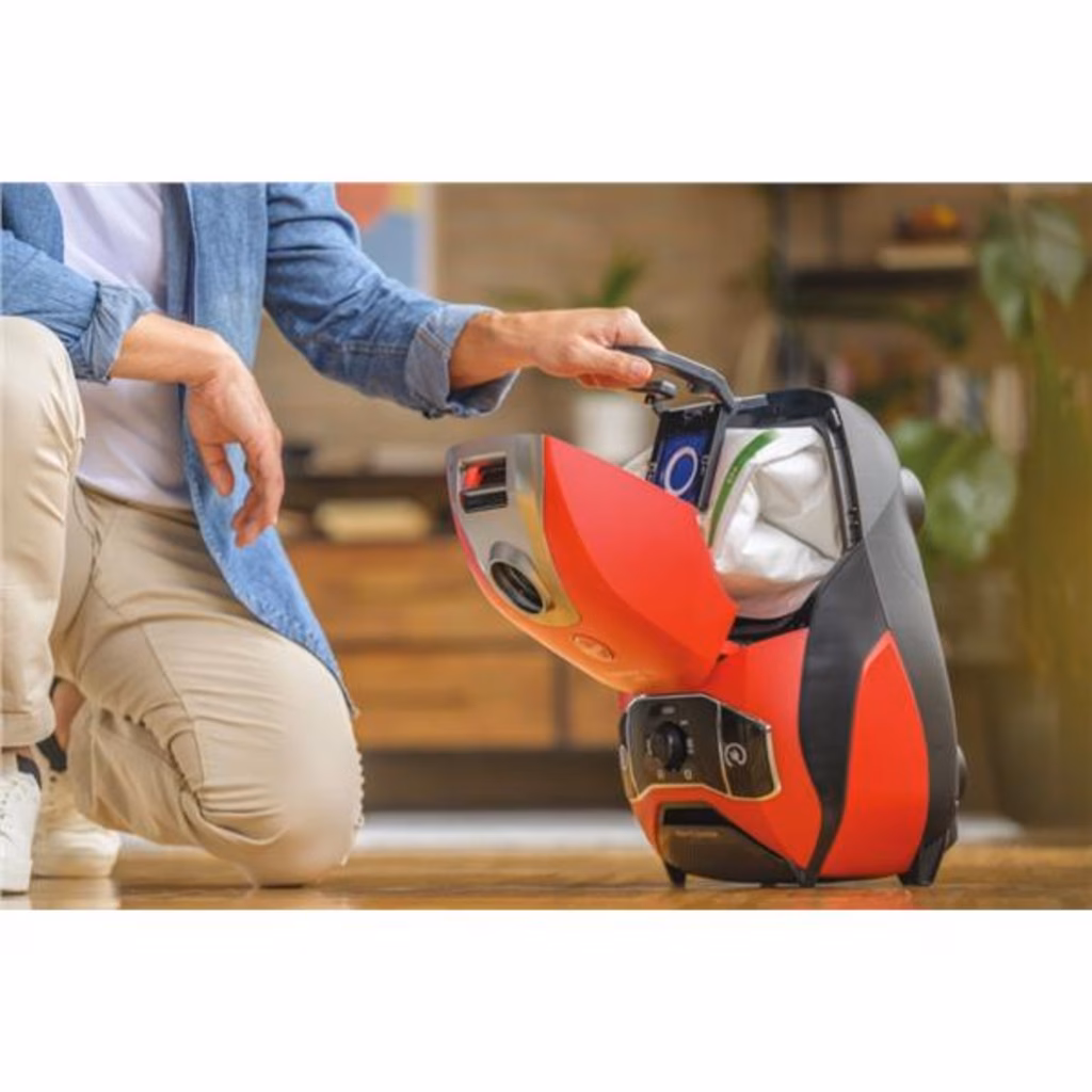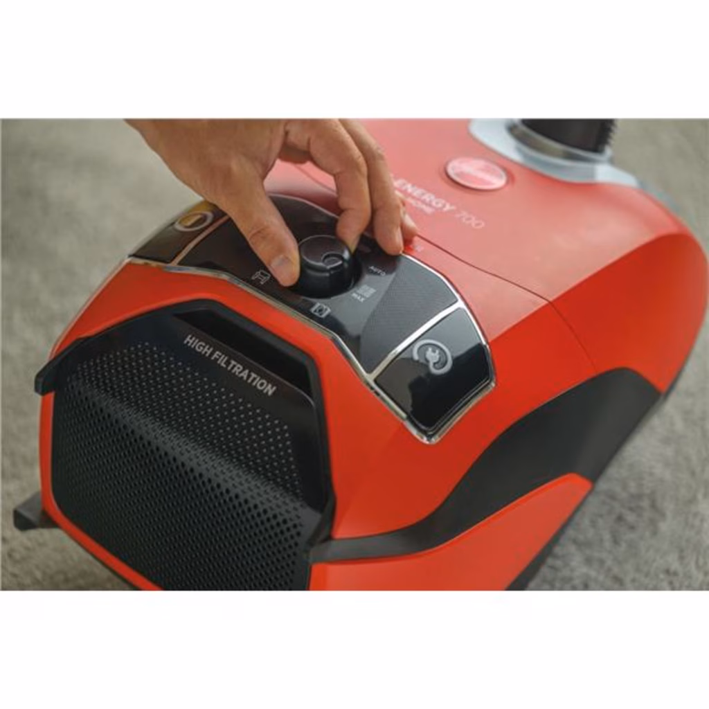 HE710HM 011H-ENERGY 700 Massima igiene e prestazioni adatte a ogni esigenza: H-ENERGY 700 è l'aspirapolvere con sacco da 5 Litri che consente risultati di pulizia eccezionali.Potenza automaticaGrazie alla funzione AUTO, l'aspirapolvere H-ENERGY 700 regola automaticamente il livello di potenza per permetterti di pulire la tua casa con il minimo sforzo. Quando il sensore riconosce che il pavimento è sporco, aumenta la potenza; quando riconosce che il pavimento è pulito, la potenza automaticamente decresce.Massimo livello di igieneL aspirapolvere con filtro hepa garantisce l'assenza di contatto con la polvere grazie al suo sistema automatico di rimozione del sacco. È sufficiente premere il pulsante per sganciare il sacco dalla tua aspirapolvere a traino nel modo più igienico possibile. Ideale per chi soffre di allergia o di asma.Alta efficienza di filtraggioDotato di un sacco Epa da 5 Litri e di un filtro Epa antibatterico e lavabile per consentire un ottimo filtraggio dell'aria.Estremamente silenziosaUna progettazione studiata per ottenere ottimi risultati di pulizia su tutte le superfici con un basso livello di rumorosità: solo con 64 dBA, la tua aspirapolvere silenziosa!Controllo intuitivoSeleziona la modalità pulizia direttamente dalla manopola attraverso il nuovo controllo intuitivo. Imposta la modalità AUTO per permettere al dispositivo di regolare automaticamente la potenza, in alternativa, potrai scegliere manualmente il livello di potenza desiderato.Raggio d'azione di 9,5 mH-ENERGY 700 possiede un cavo della lunghezza di 9,5 m grazie al quale è possibile raggiungere facilmente anche i punti più lontani senza doversi fermare o togliere la presa.Impugnatura ergonomicaH-ENERGY 700 presenta una comodissima impugnatura ergonomica caratterizzata da una spazzola integrata ideale per le superfici dure.Spazzola ParquetDotato della spazzola parquet, ideale per le superfici in legno. Grazie alle sue setole delicate e alle ruote in feltro potrai pulire tutte le superfici, anche le più delicate, senza il rischio di rigature.