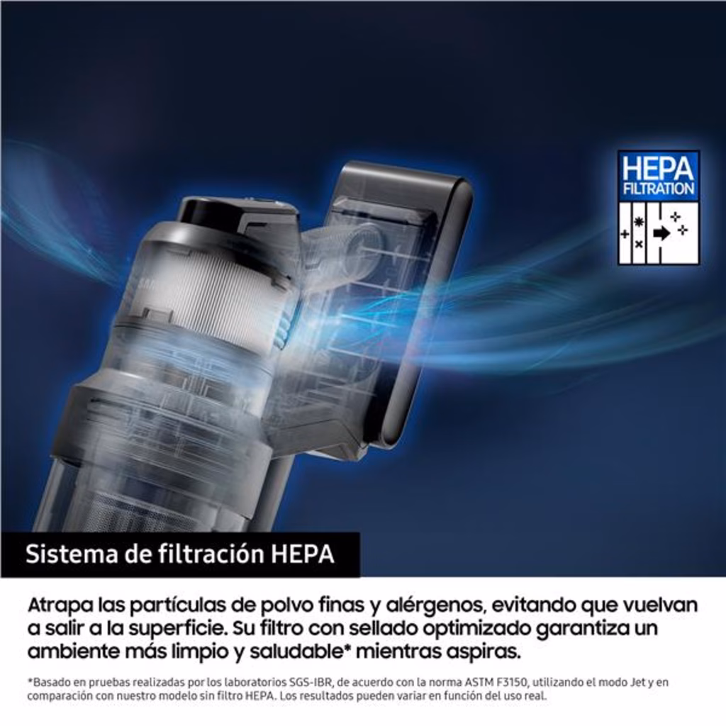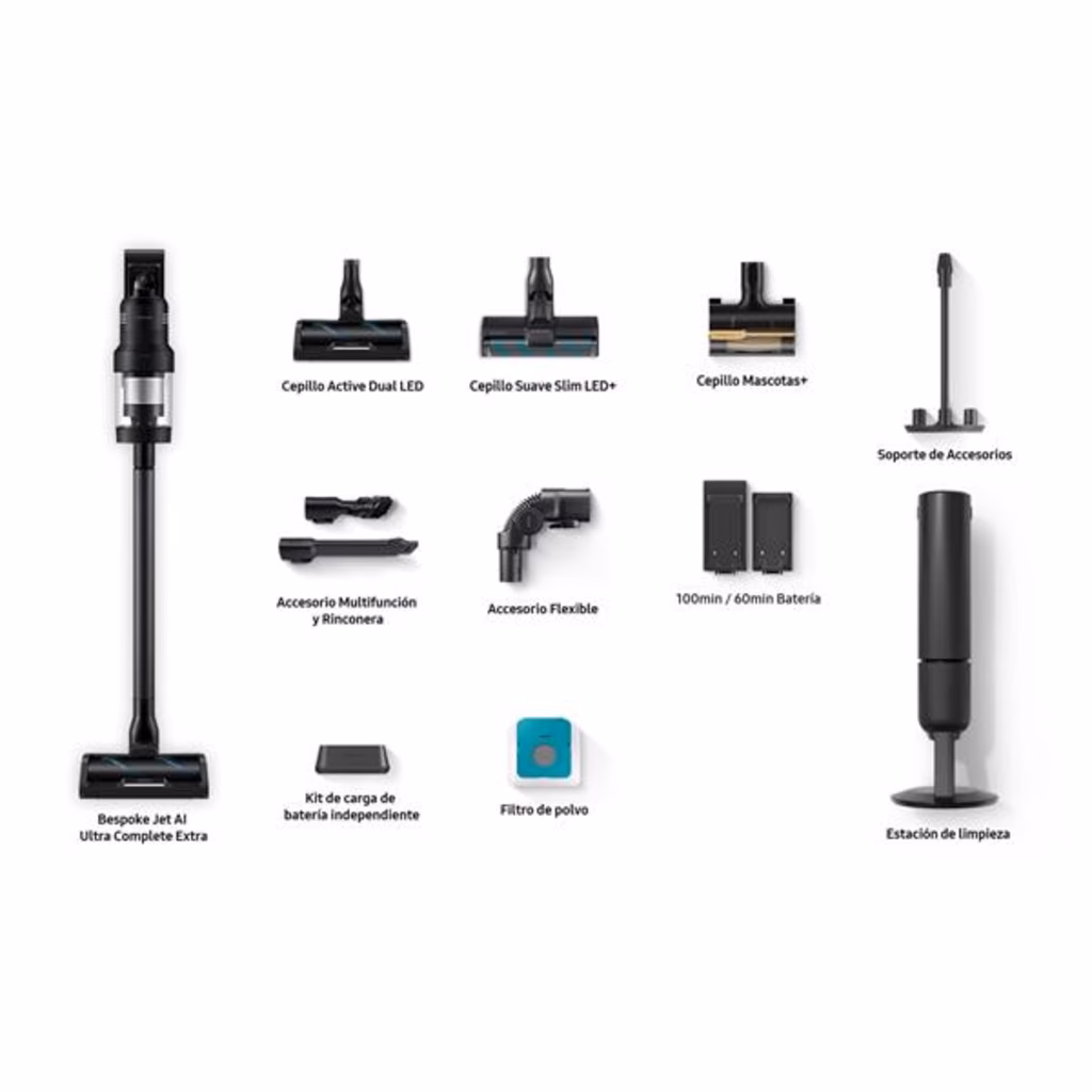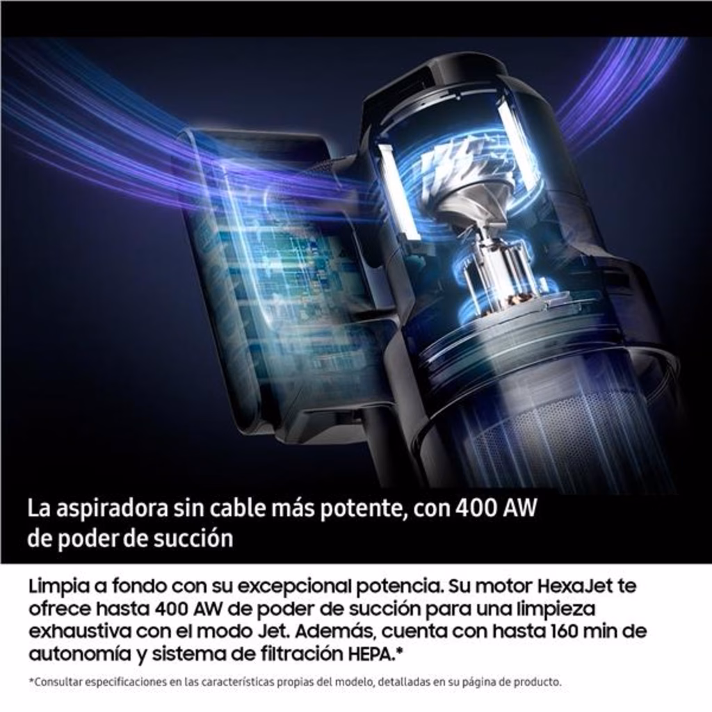 Samsung Aspirapolvere senza filo Bespoke Jet Ultra AI complete extra 400W VS90F40DEKUnincredibile potenza di aspirazioneFino a 400 W di potenzaProfonda pulizia dei pavimenti con la scopa elettrica Jet più potente[1]. Il motore HexaJet è in grado di generare una potenza di aspirazione fino a 400 W[2] , per pulire efficacemente tutti i tipi di superficie. Il filtro d'aria multi-ciclonico intrappola anche le particelle di polvere più sottili e la batteria a lunga durata ha un'autonomia fino a 100 minuti[3] , dandoti il tempo per pulire tutta la casa. Inoltre, con la seconda batteria arriva a 160 min (100+60 min di autonomia con le due batterie).Pulizia intelligenteModalità AI Cleaning 2.0 (con spazzola Active Dual)Pulizia profonda ed efficiente in tutta la casa con prestazioni ancora più avanzate e intelligenti. La modalità AI Cleaning 2.0 è in grado di identificare e classificare ogni genere di ambienti di pulizia, ad esempio diversi tipi di moquette. Offre le stesse prestazioni della modalità Mid, riducendo il consumo della batteria del 14% e aumentando la manovrabilità del 6%.Aria più pulitaSistema di filtraggio HEPADa oggi potrai respirare un'aria più pulita e con meno polvere[4] , senza più pensieri o preoccupazioni. Il sistema di filtraggio HEPA, grazie a un filtro per le polveri sottili ancora più efficiente e con una tenuta semplicemente perfetta, è in grado di ridurre in modo efficace la quantità di particelle di polveri sottili[5] rilasciate nell'aria. In questo modo, laria emessa sarà più pura rispetto agli aspirapolvere Samsung senza filtro HEPA, per una casa sempre pulita.Facile da svuotare e caricareClean Station all-in-oneSvuota e ricarica la tua scopa elettrica in modo facile, veloce e nel massimo dell'igiene con l' All-in-One Clean Station .Posiziona la scopa nella base di ricarica, clicca semplicemente un tasto e il contenuto verrà svuotato all'interno della Clan Station e nel frattempo la scopa di ricaricherà.Grazie alla tecnologia "Air Pulse" il contenitore viene svuotato efficacemente[6] , il filtro ciclonico rotante trattiene il 99% dei peli di animale[7] grazie alla tecnologia Air Spin Edge e intrappola il 99,999%[8] delle polveri sottili.Dopo lo svuotamento il serbatoio si richiude automaticamente e la scopa è pronta per tornare ad aspirare tutte le superfici di casa.Potenza aspirante fino a 400W & massima libertà di movimentoMotore HexaJetPulizia efficace, senza fatica. Leggero[9] e potente, il Motore HexaJet ha un design innovativo progettato per ottimizzare il flusso d'aria e l'efficienza.