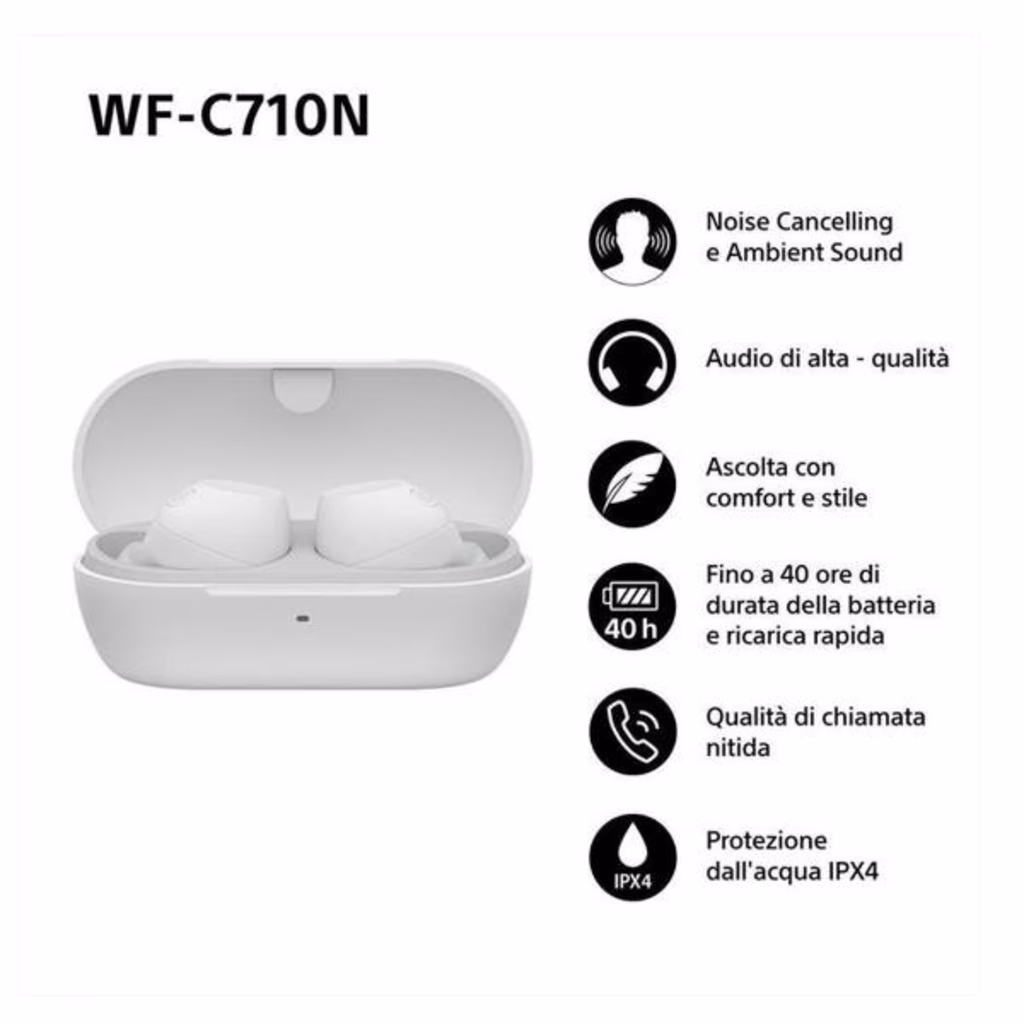 Scopri un esperienza di ascolto immersiva con gli auricolari Sony WF-C710N, progettati per offrirti musica e chiamate di alta qualità ovunque tu sia. Grazie alla tecnologia Noise Cancelling con doppio microfono, ogni auricolare rileva e riduce i rumori indesiderati sia interni che esterni, permettendoti di concentrarti solo su ciò che conta.