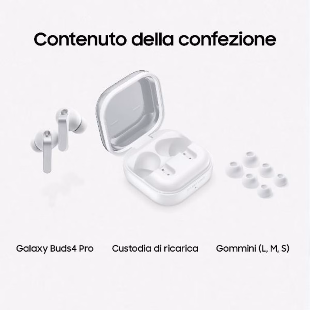 Galaxy Buds4 Pro unisce design premium in metallo e comfort ergonomico a un suono potente e dettagliato grazie al sistema a 2 vie con doppi amplificatori e audio fino a 24-bit/96 kHz. Con Galaxy AI gestisci funzioni e chiamate con semplici gesti e sfrutti l Interprete per traduzioni in tempo reale. La tecnologia DNN garantisce chiamate nitide anche nel rumore, mentre la custodia compatta e trasparente le rende pratiche da portare sempre con te.