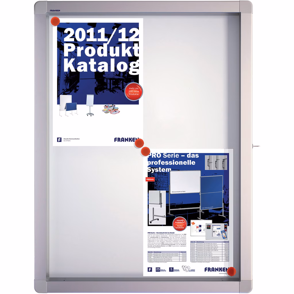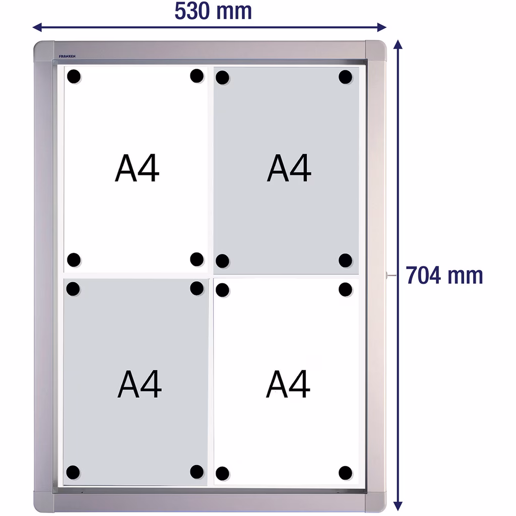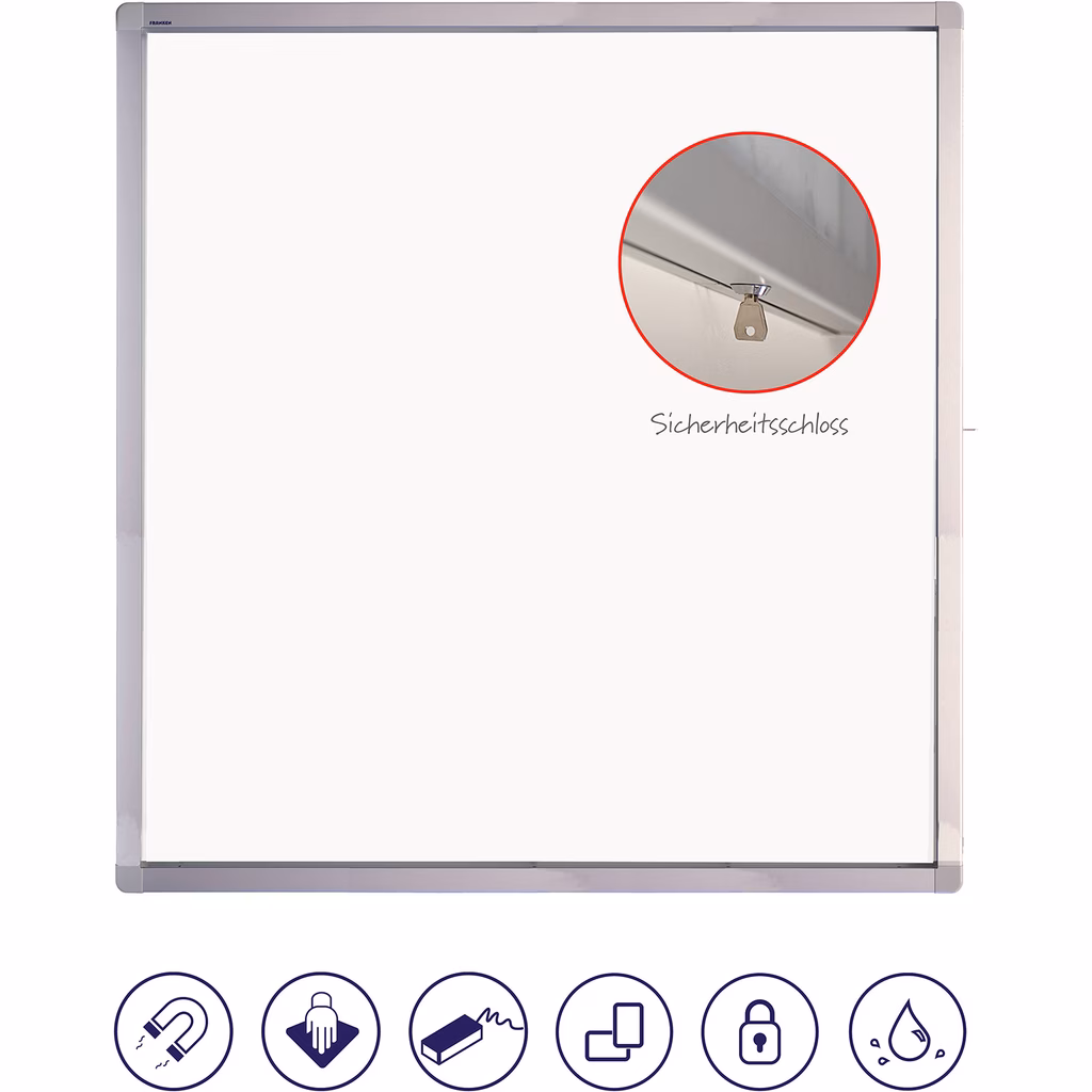 Elegante bacheca da esterno resistente alle intemperie, con superficie magnetica e cornice in alluminio anodizzato (2,5 cm). Può essere esposta in formato verticale o orizzontale. Completa di porta in vetro di sicurezza con serratura integrata e kit di montaggio a parete. Può contenere 4 documenti A4, dimensioni della vetrina 53 x 70,4 x 4,5 cm.