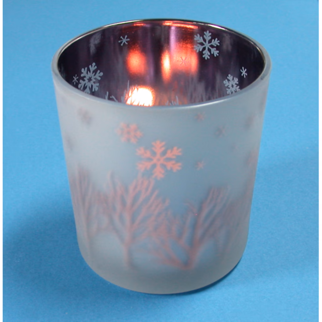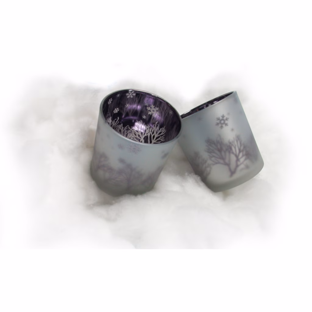Conf. 2 - Luminosissimo bicchiere portacandela dalla lavorazione a doppio effetto, satinato esternamente in grigio e metallizzato internamente in viola, con sagome disegnate di alberi effetto paesaggio innevato - Dimensioni HxØ cm 9x8