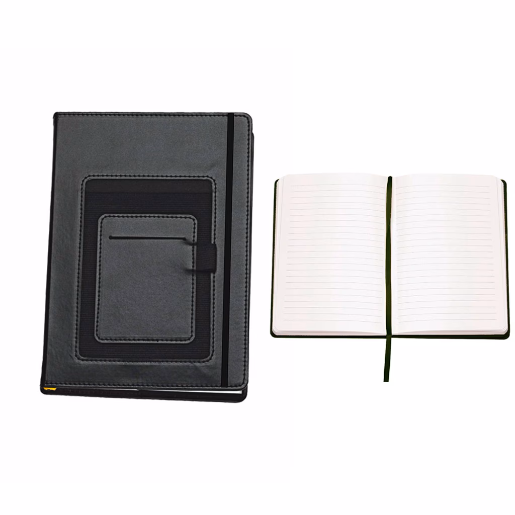 Blocco notes con elastico con tasca frontale porta cellulare - copertina in poliuretano - 100 fogli/200 pagine in carta bianca a righe - vari scomparti esterni portacellulare, portacard e portapenna - fornito confezionato in scatola di cartone bianco - formato A5 cm 14,2x20,5